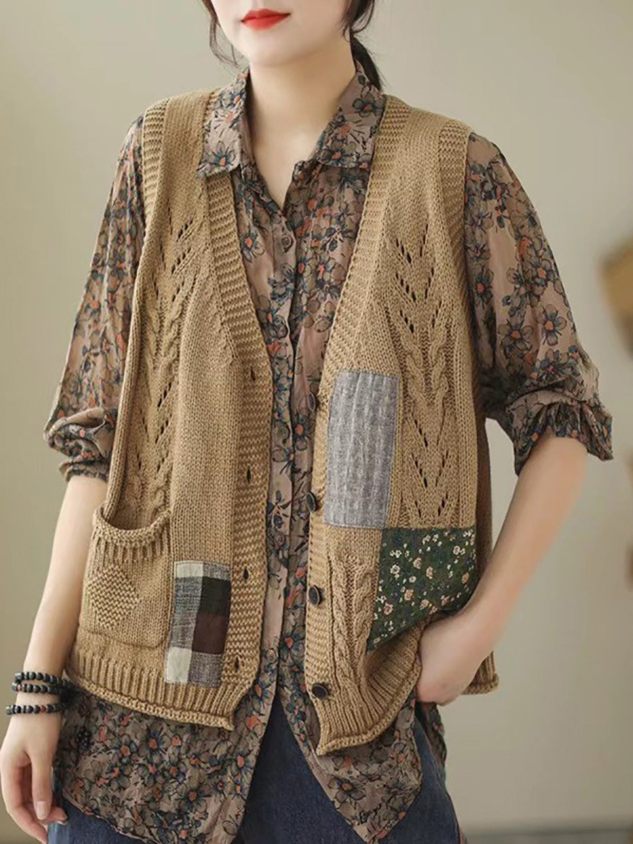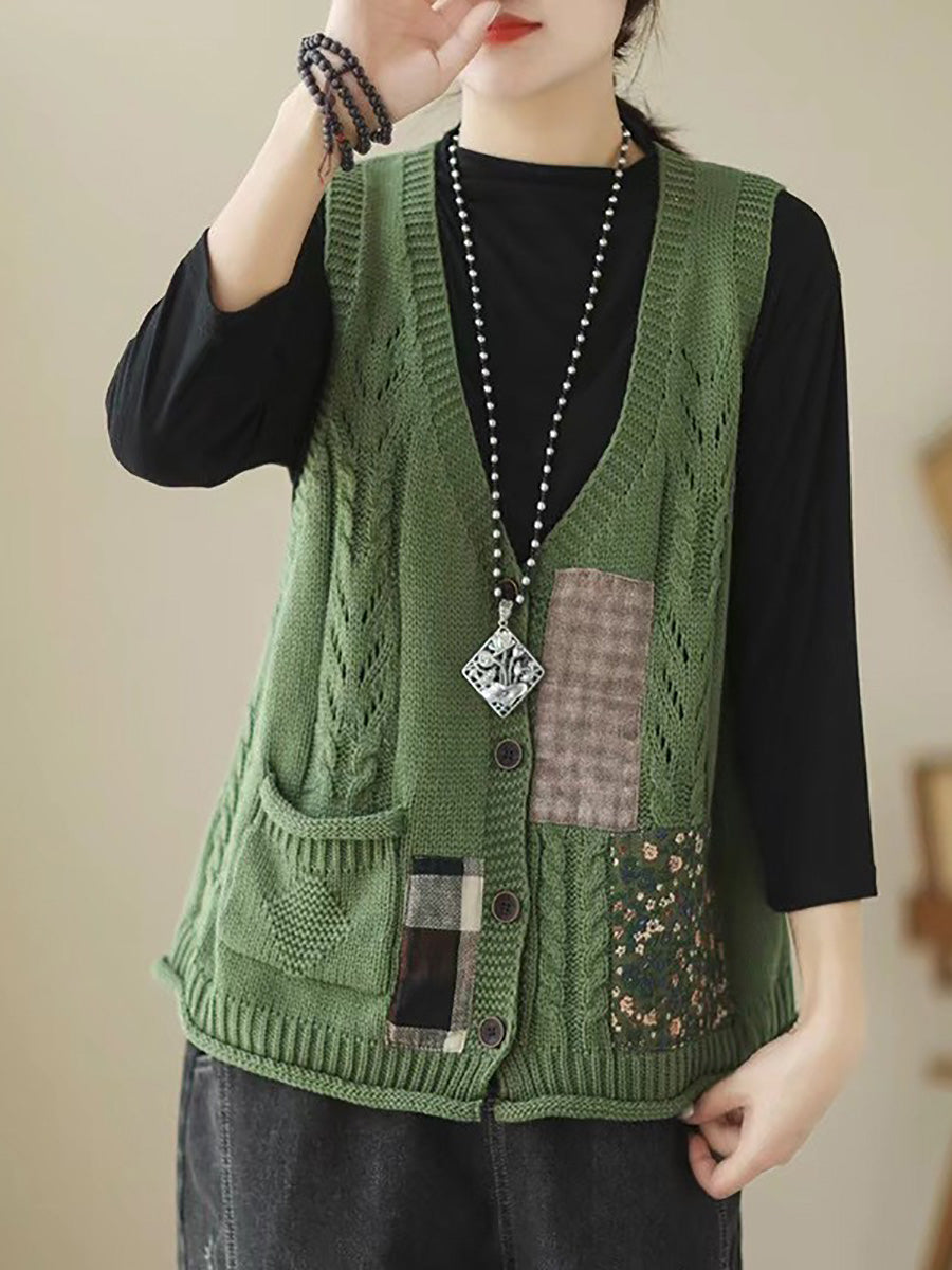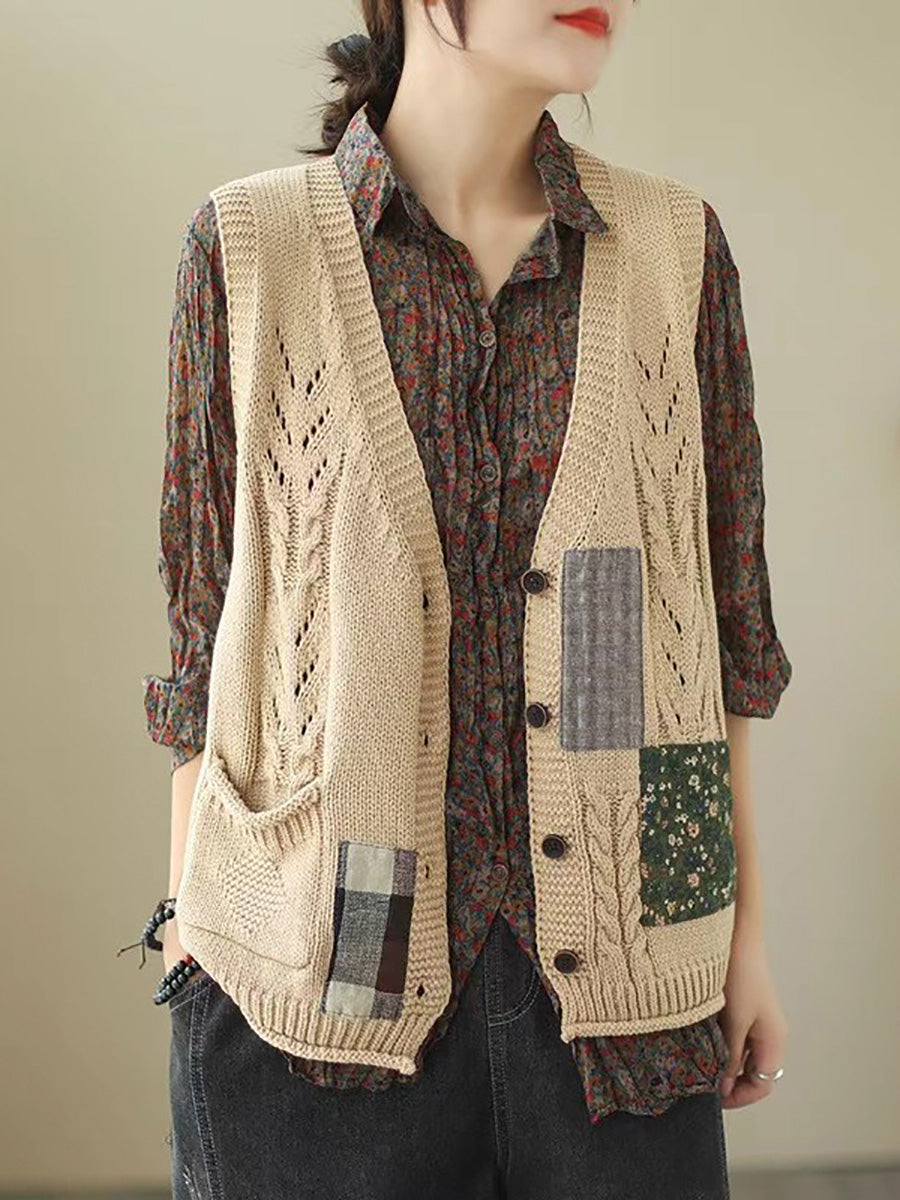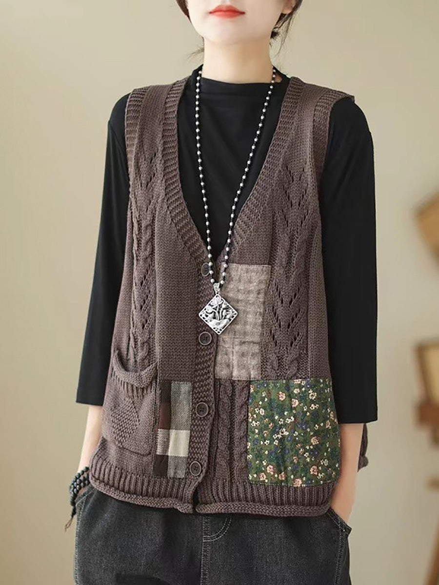 Este chaleco de punto presenta un diseño de patchwork y un cuello en V clásico, lo que le da un aire retro. Perfecto para las temporadas de otoño e invierno.