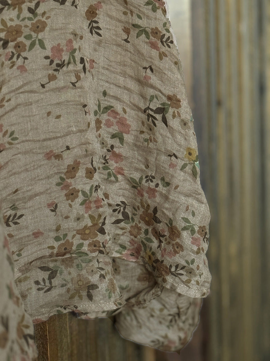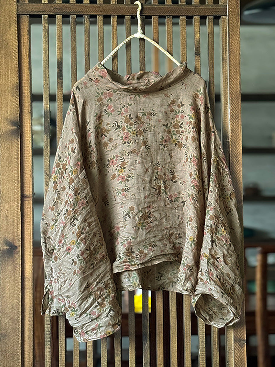 Esta blusa de ramio presenta un elegante cuello alto, mangas largas con estilo raglán y un estampado de flores otoñales de inspiración retro. Perfecta para usar en las estaciones de primavera y otoño. Fabricada con material de ramio de alta calidad.