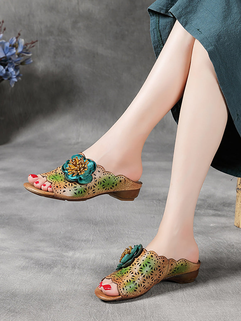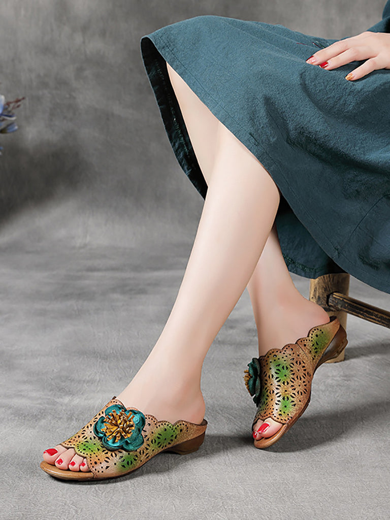 Zapatos de tacón bajo con agujeros de piel auténtica étnica para mujer