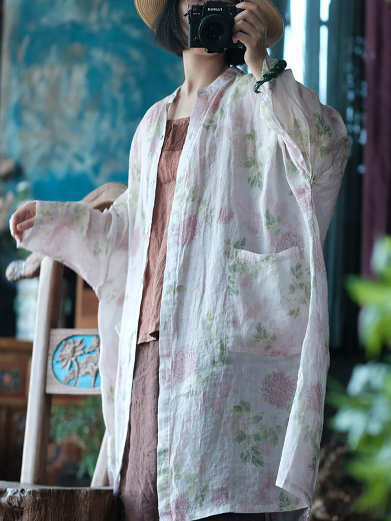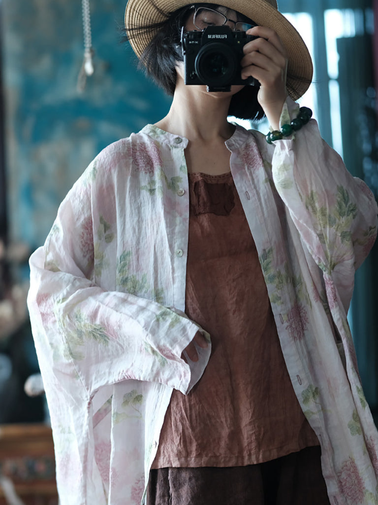 Camisa fina larga de ramio con flores vintage de verano para mujer