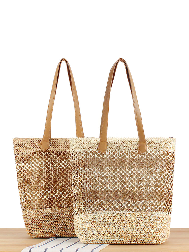 Bolso de hombro informal de tejido de paja con bloques de colores para mujer
