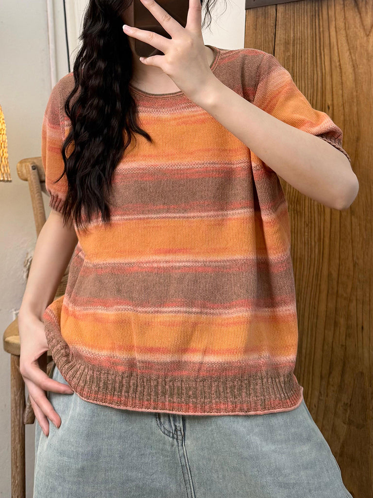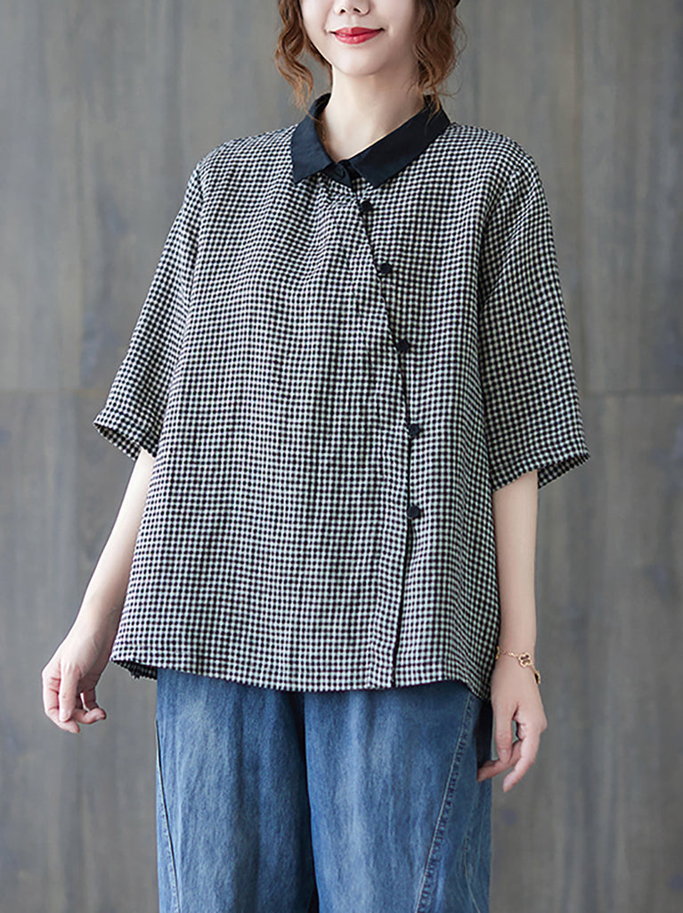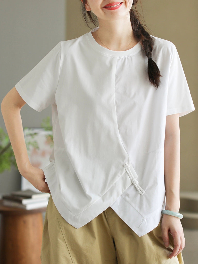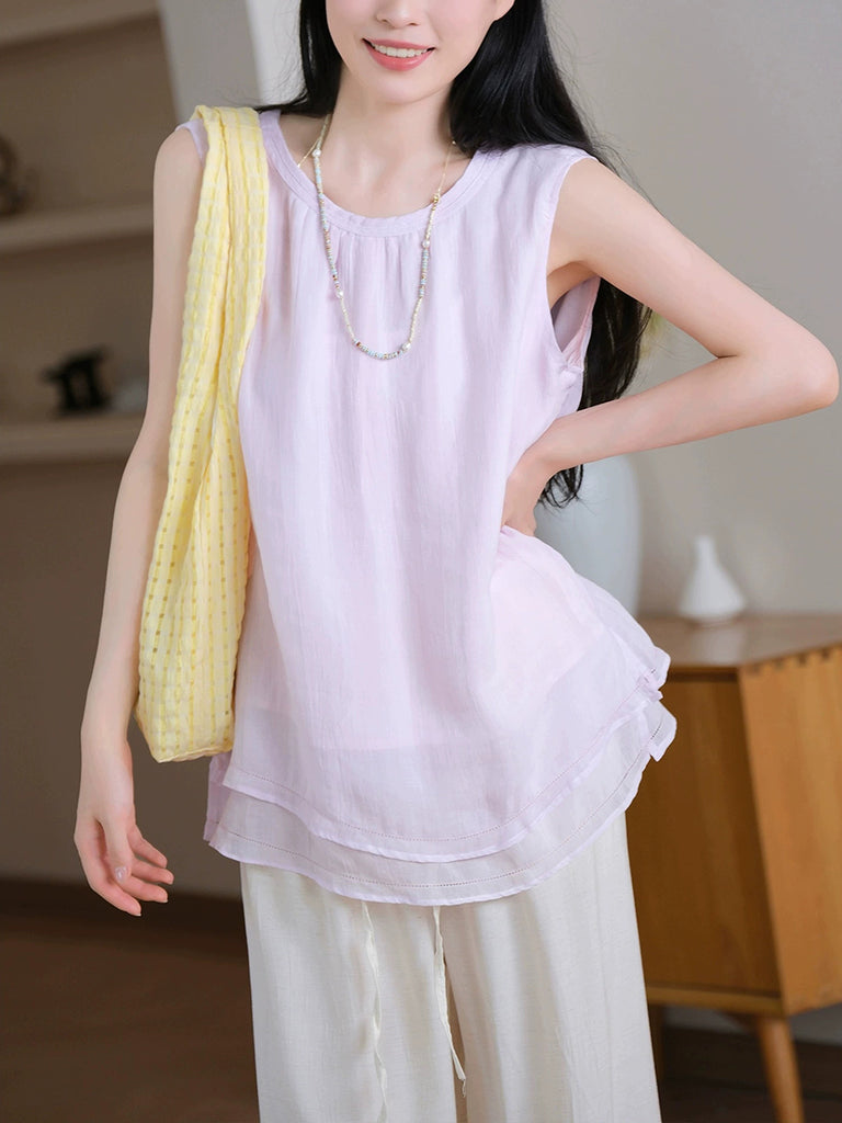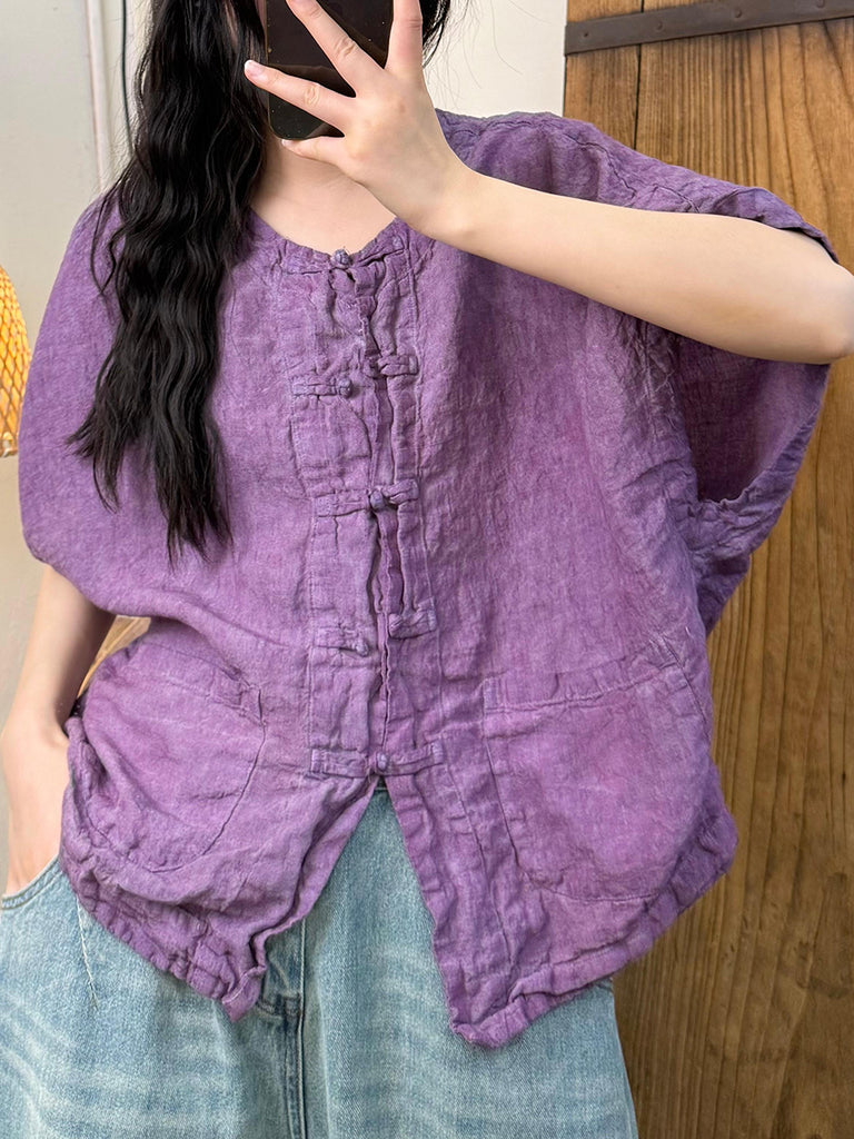 Camisa de ramio con cuello redondo, color puro y estilo artístico de verano para mujer