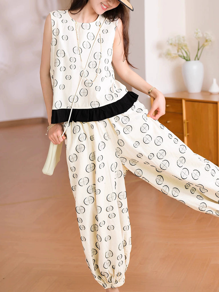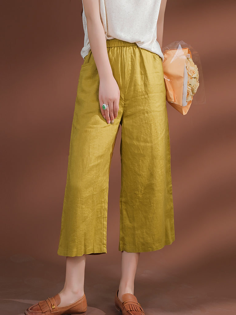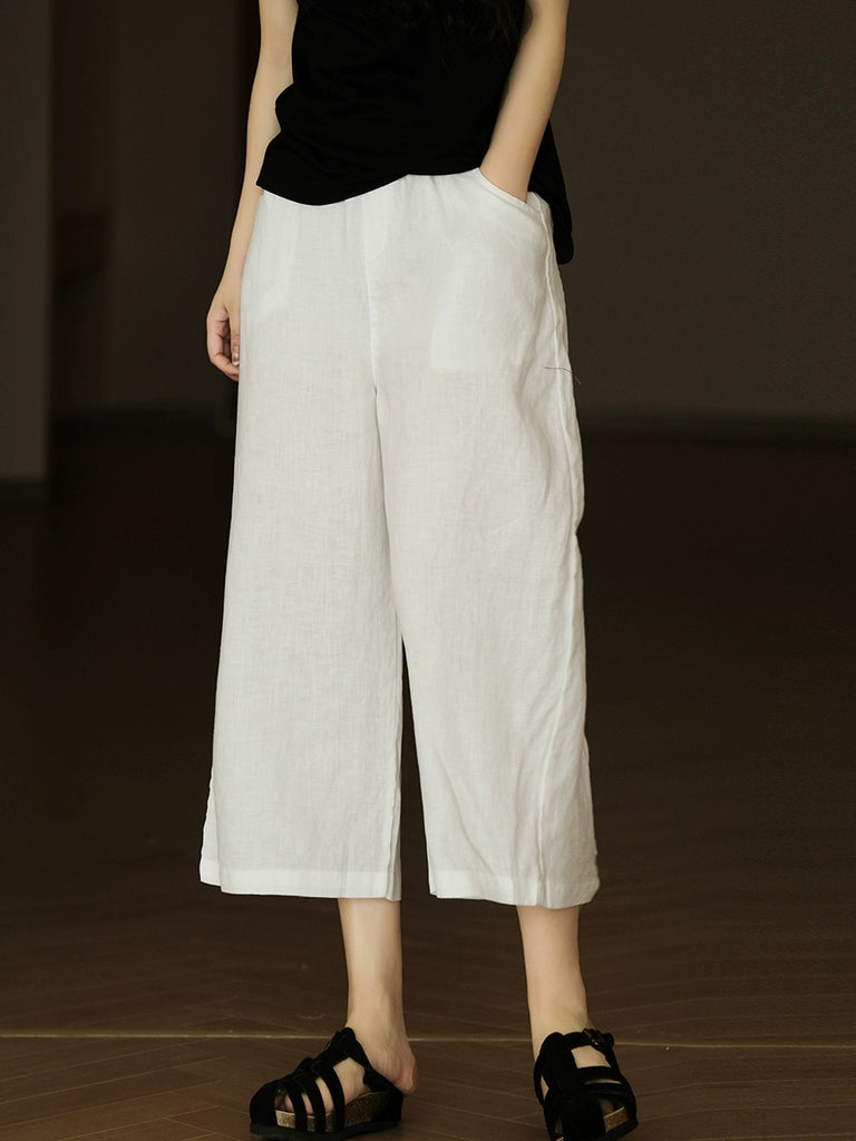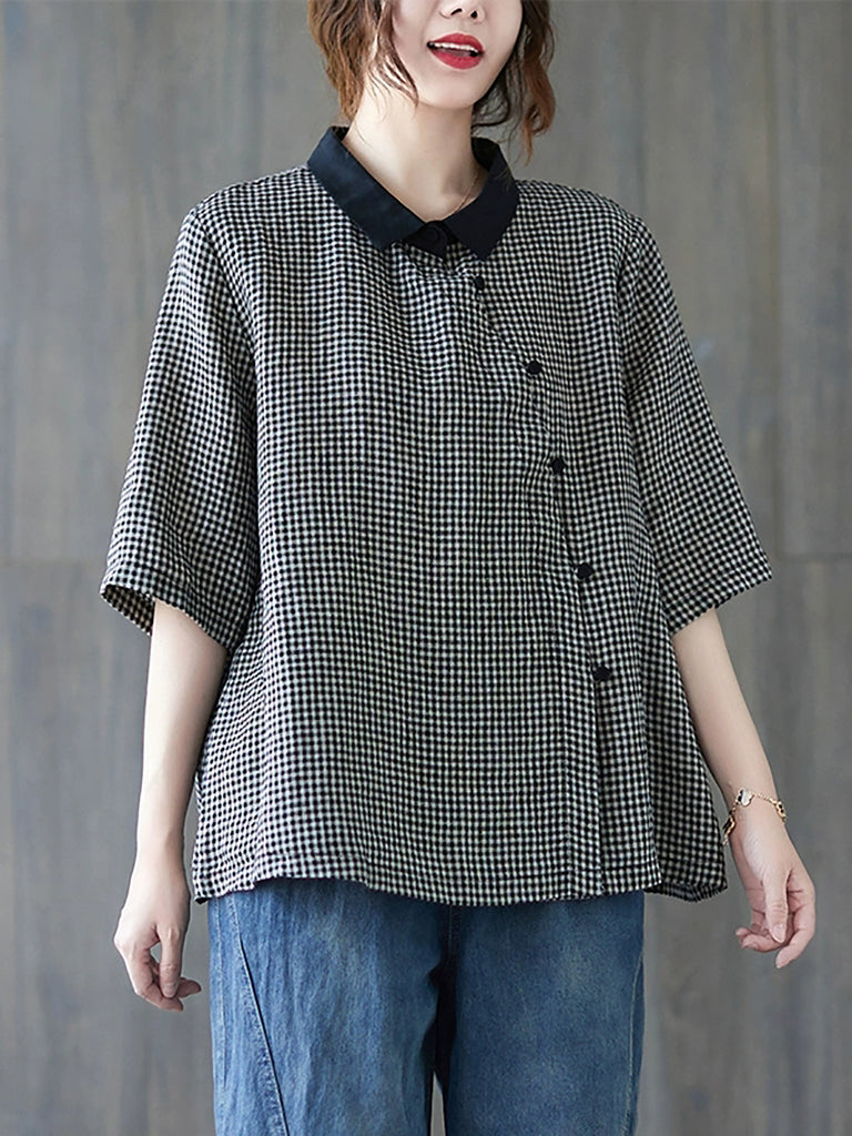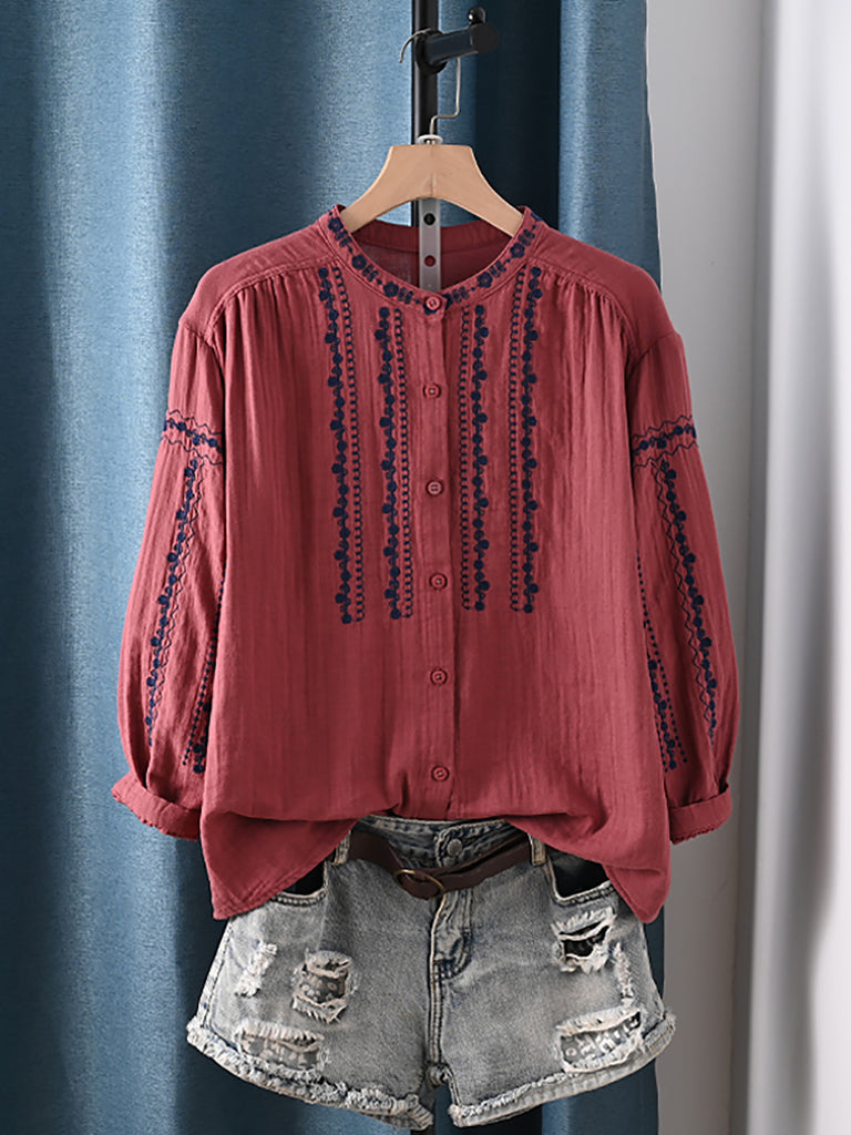 Camisa de ramio con cuello redondo, color puro y estilo artístico de verano para mujer