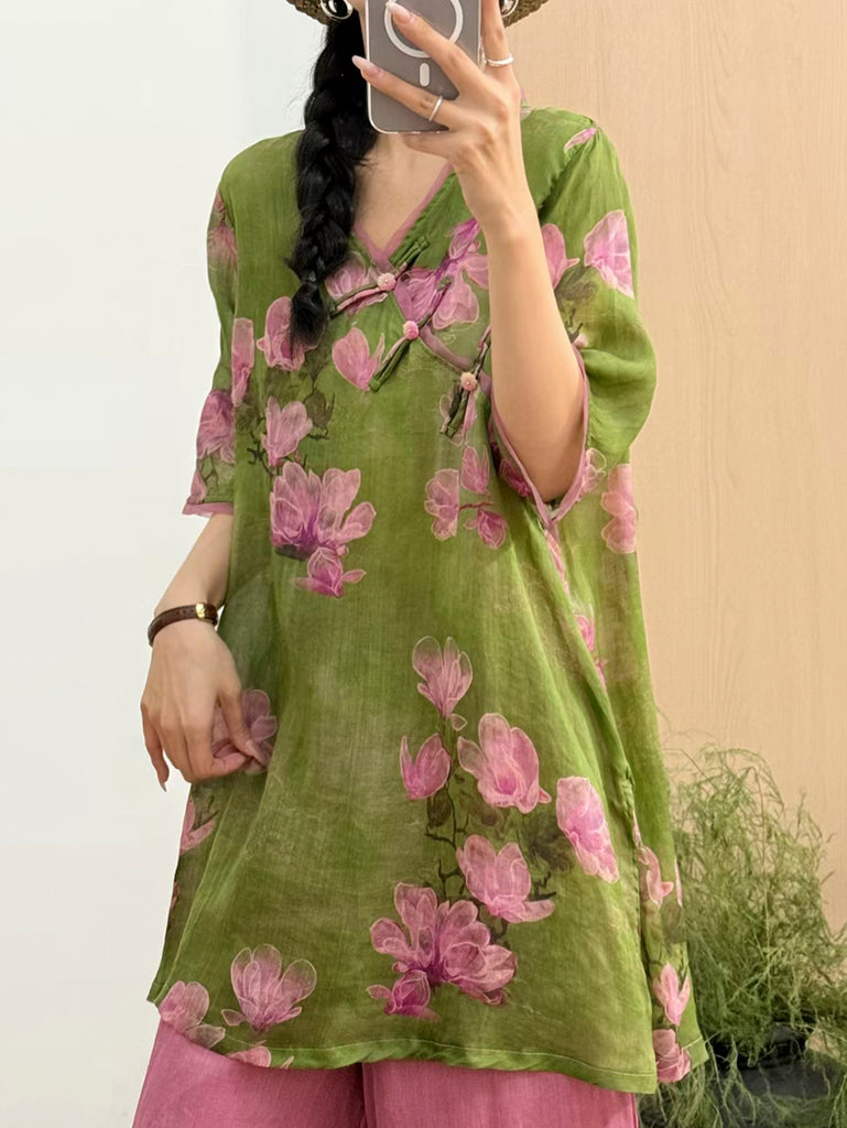 Camisa de lino con cuello en V y estampado floral retro de verano para mujer