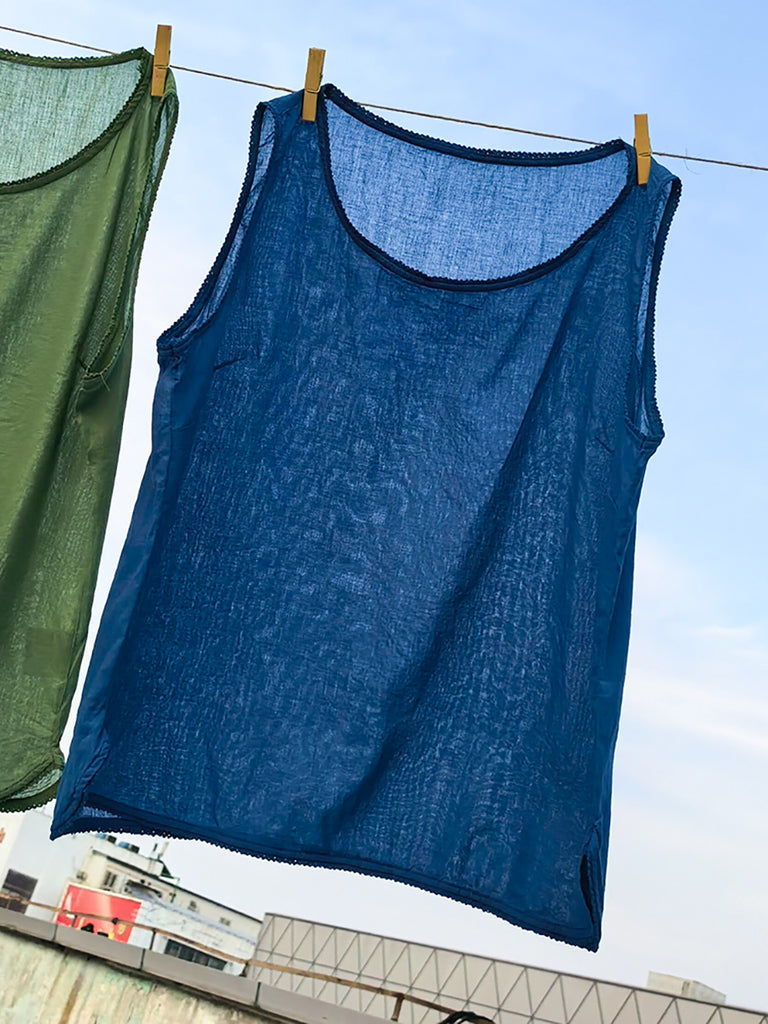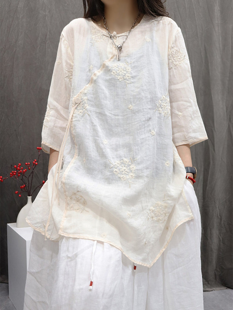 Camisa de verano para mujer, 100 % ramio, con cuello redondo y bordado de flores