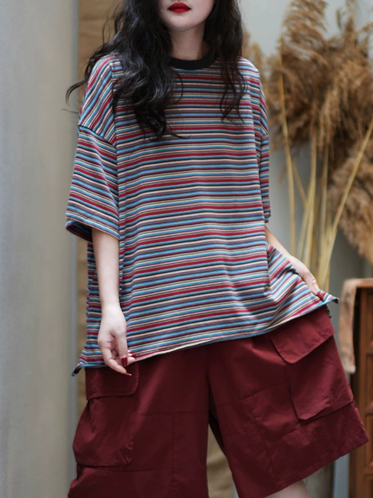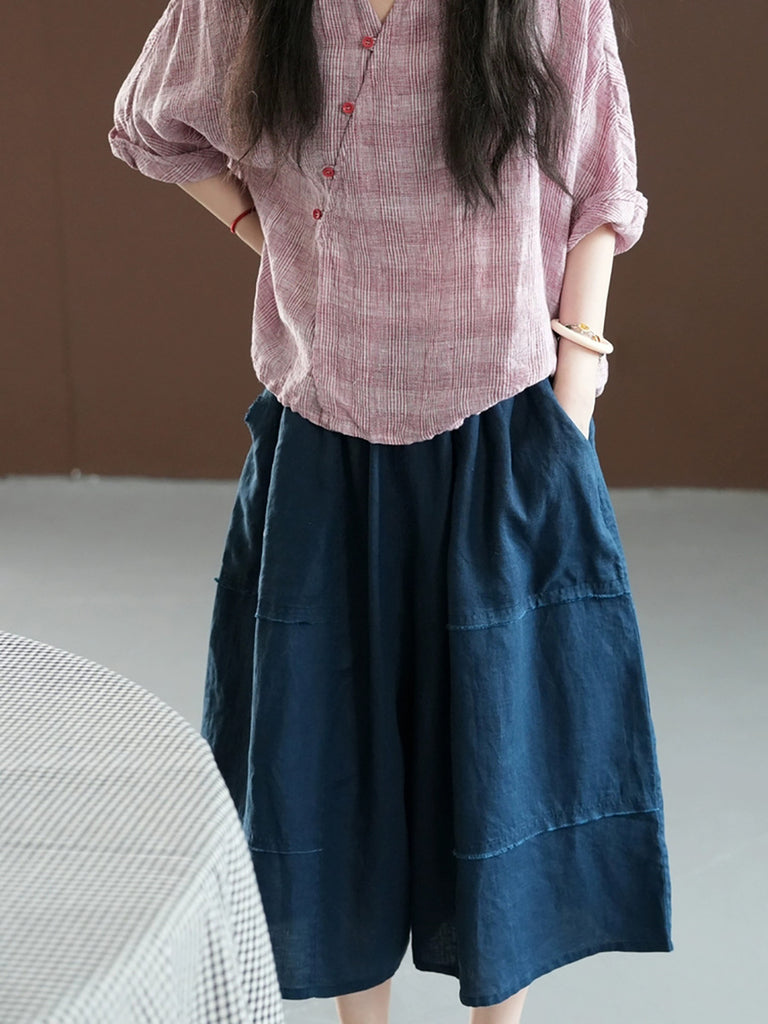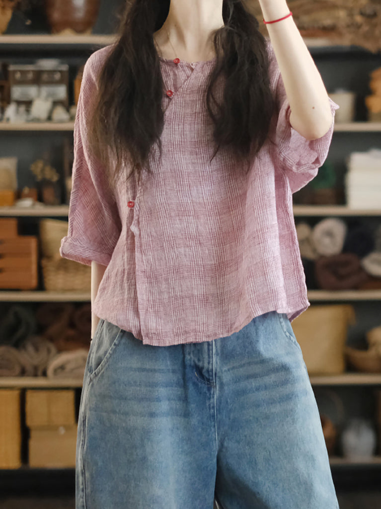 Camisa retro de verano para mujer, de algodón puro, con cuello redondo y empalme de color
