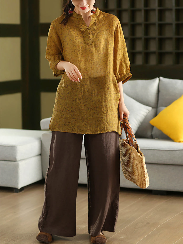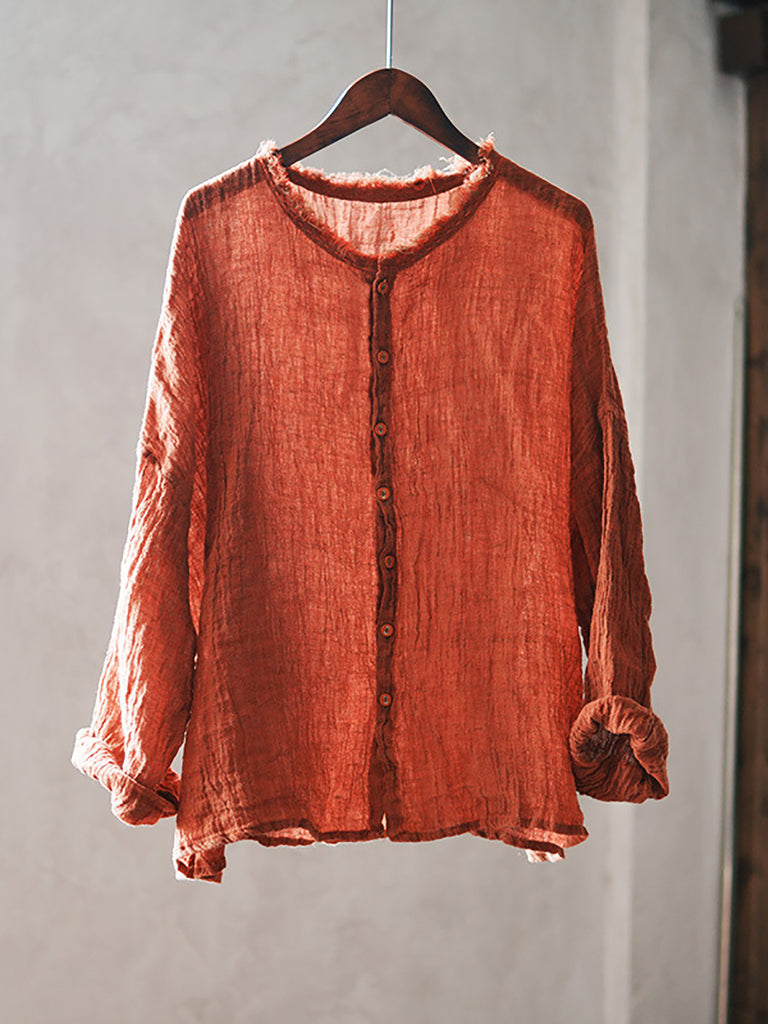 Camisa de lino con cuello redondo, estilo retro, de color puro y borde sin rematar para mujer