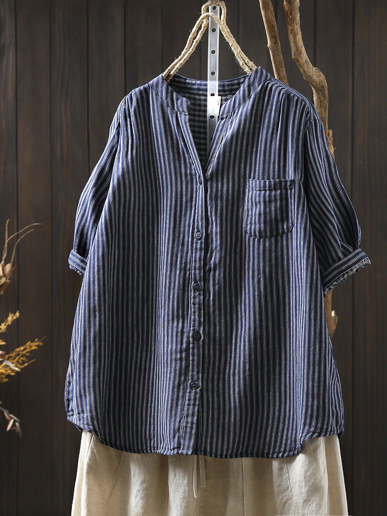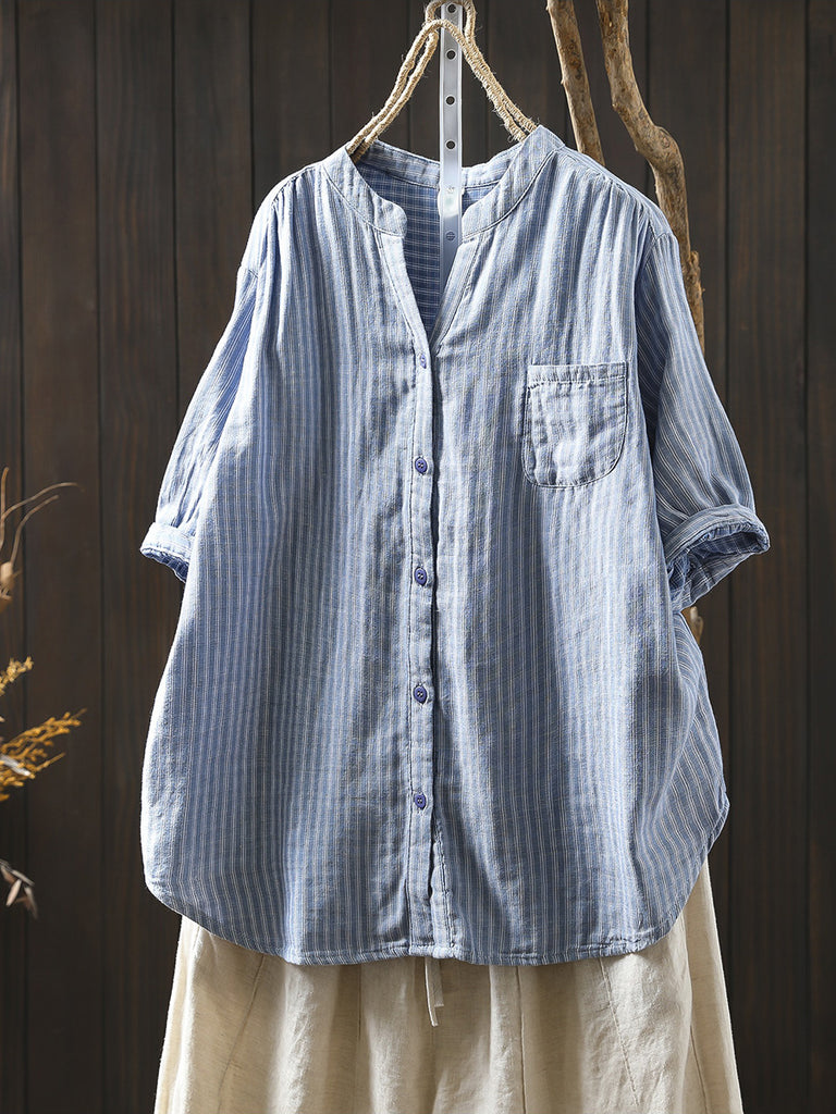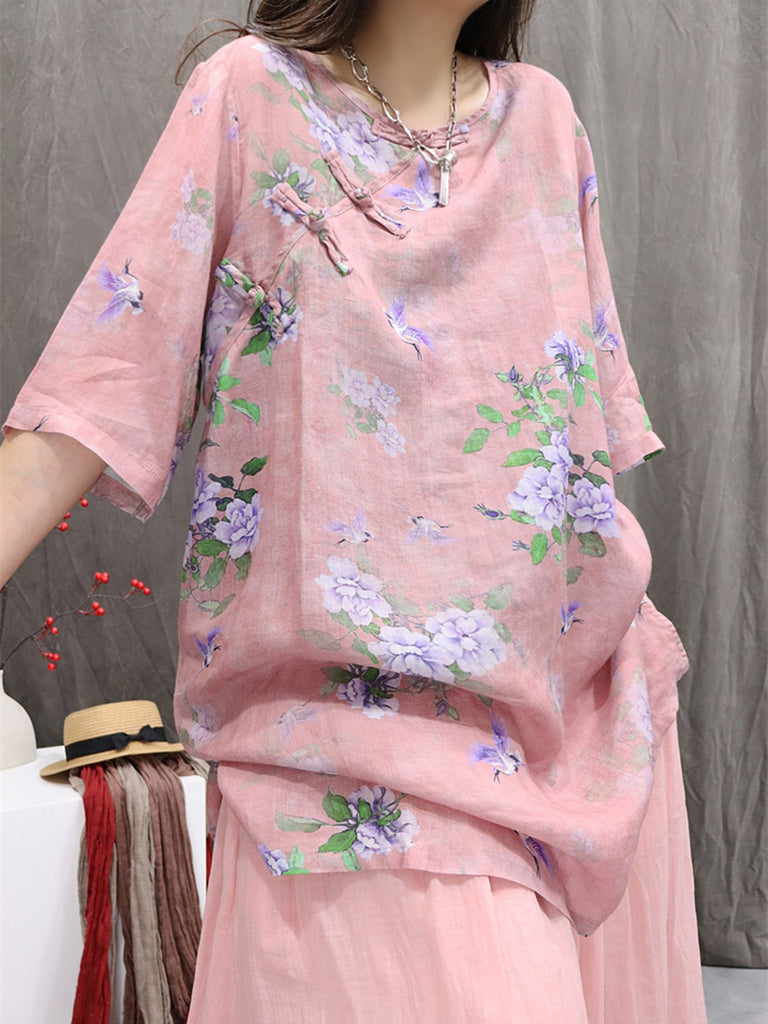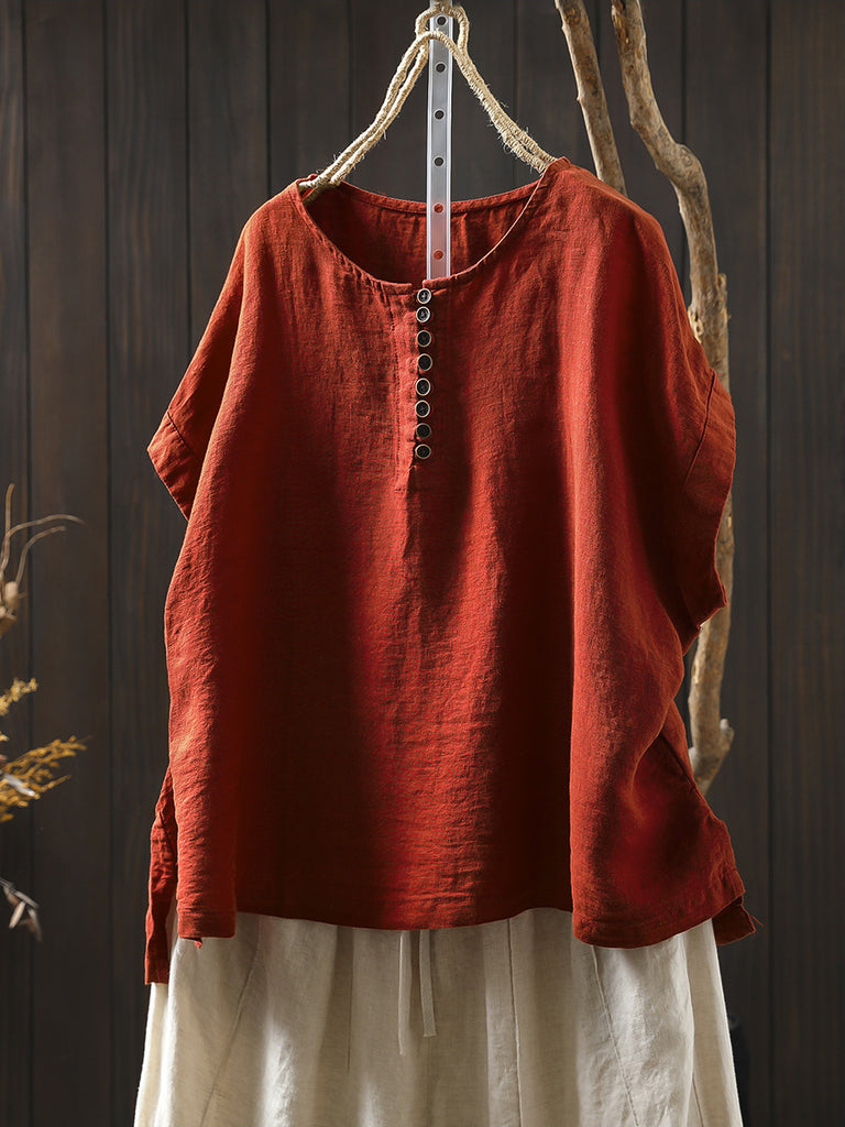 Camisa informal de verano para mujer, de lino 100 % con cuello redondo y color puro