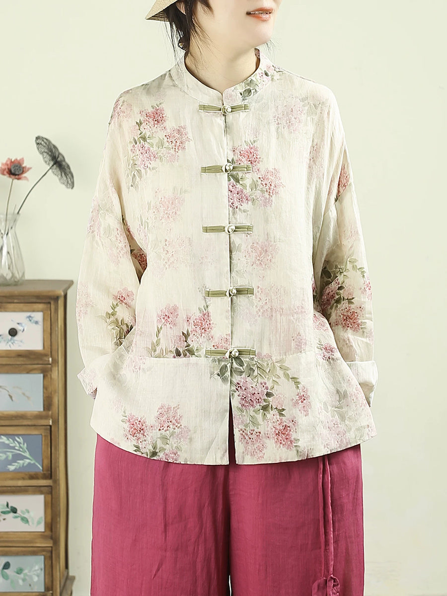 Camisa étnica de primavera para mujer, con cuello alto y flores, 100 % ramio