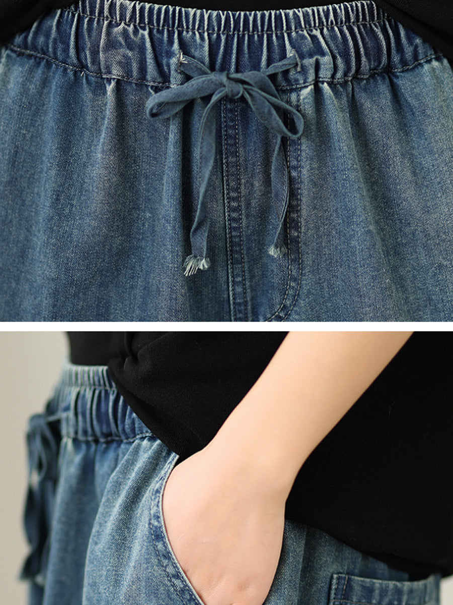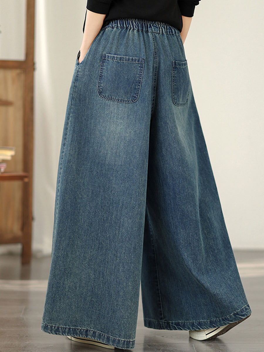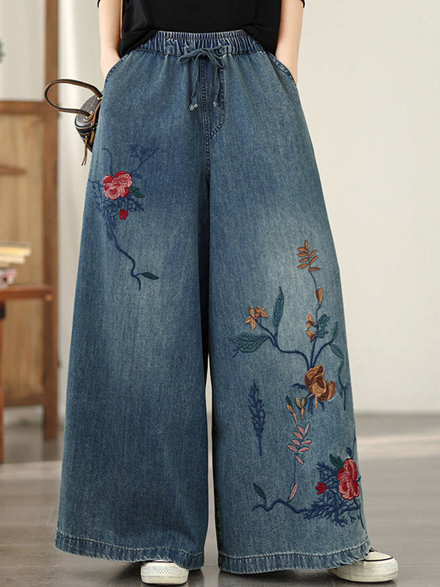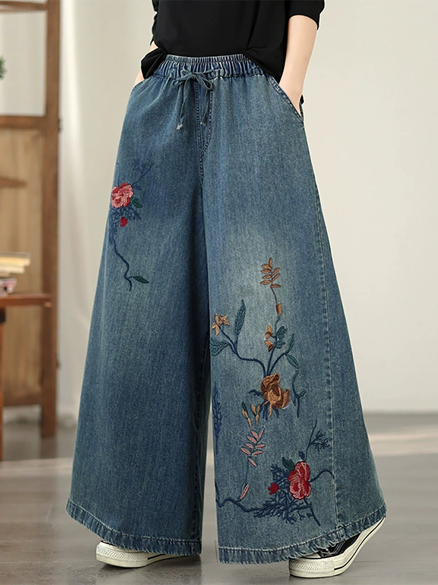 Pantalones anchos de mezclilla vintage con bordado de flores para mujer, primavera