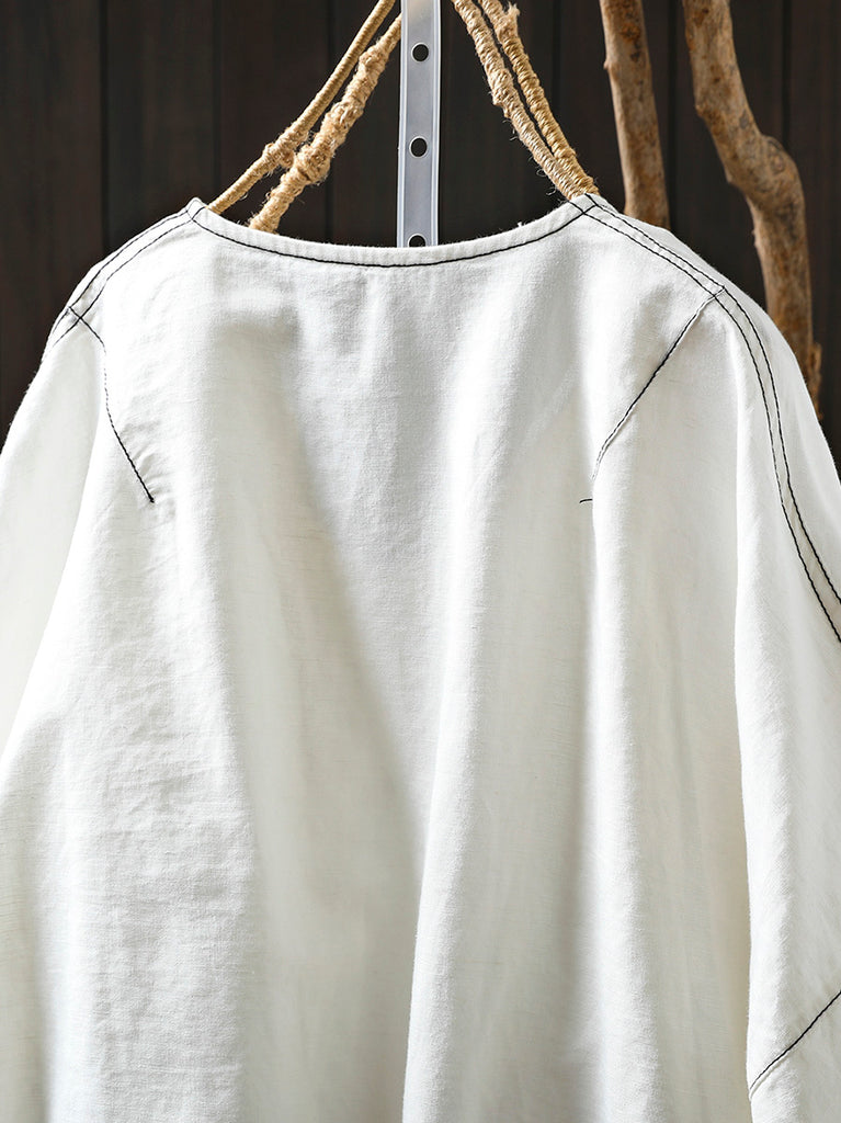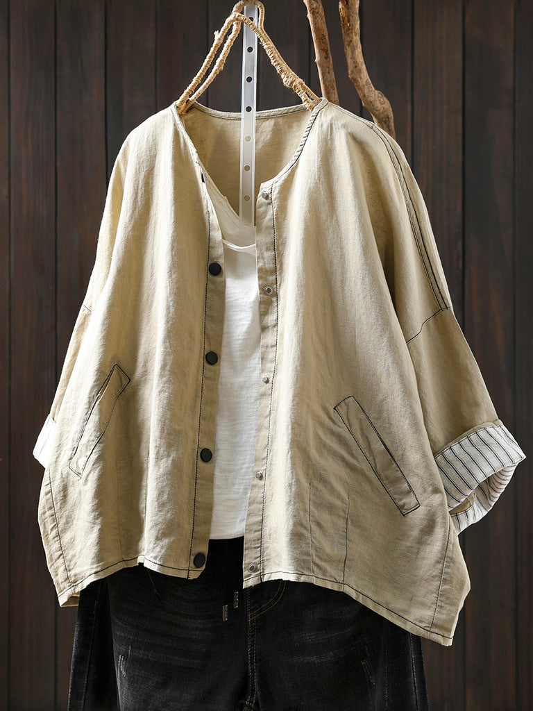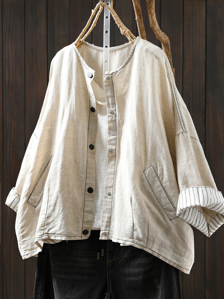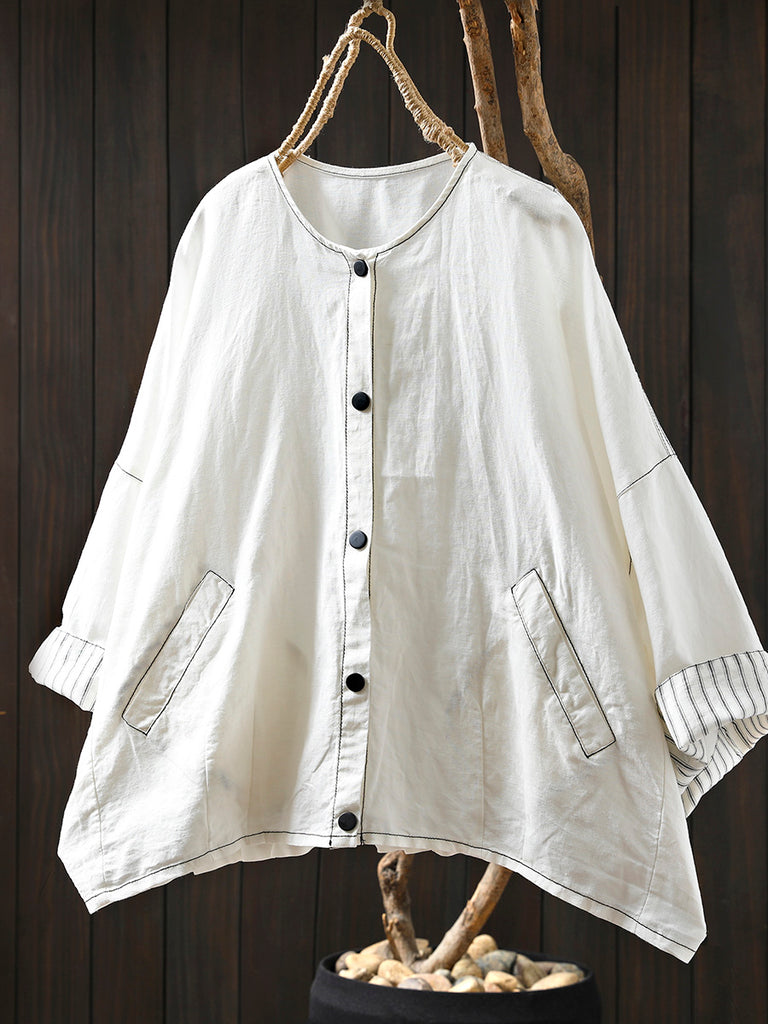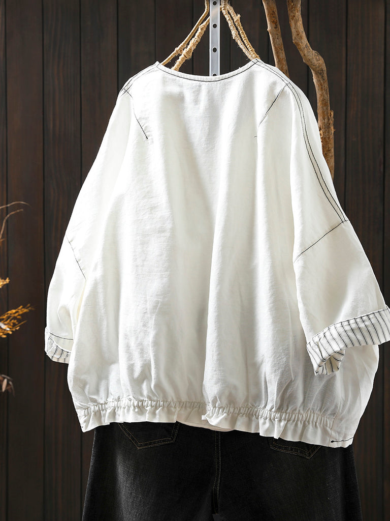 Camisa de lino de punto con cuello redondo y rayas artísticas de verano para mujer