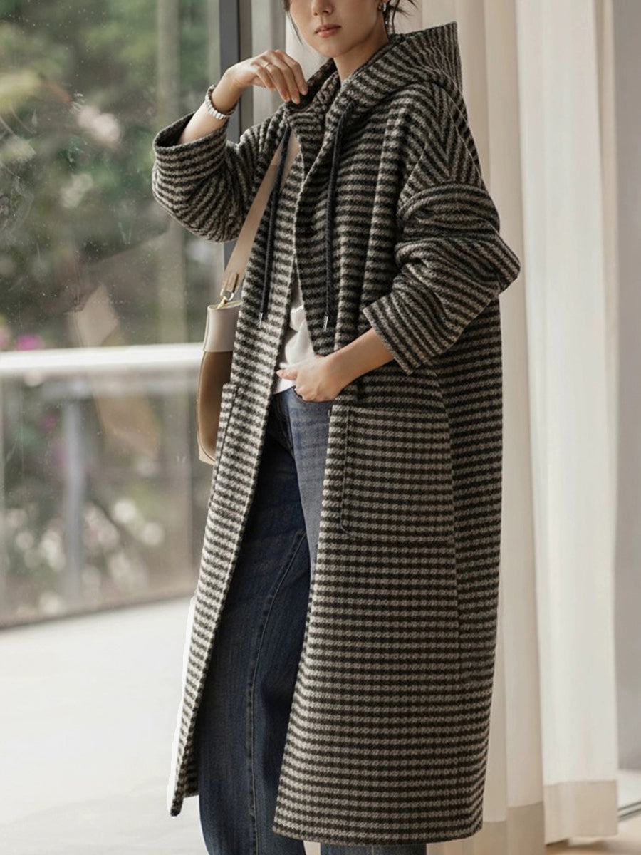 Abrigo de invierno vintage a rayas con capucha para mujer