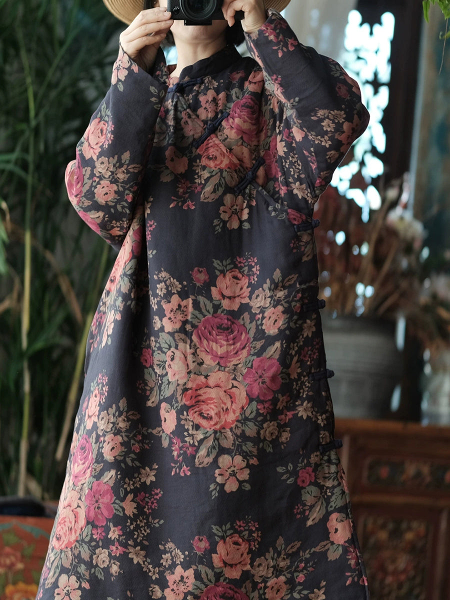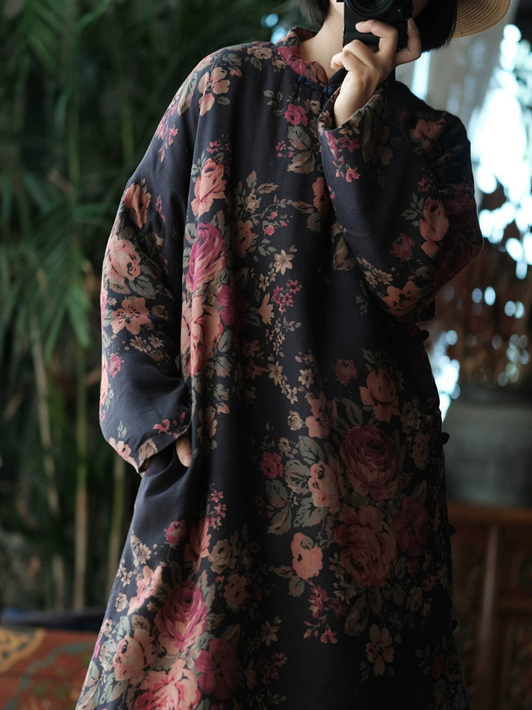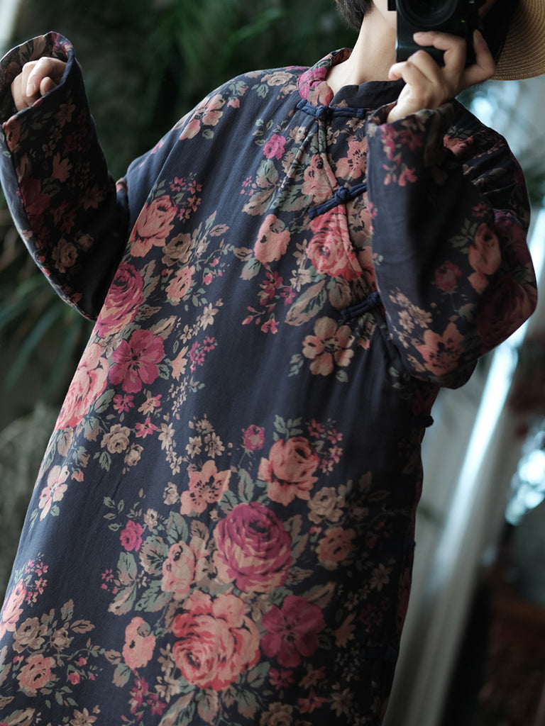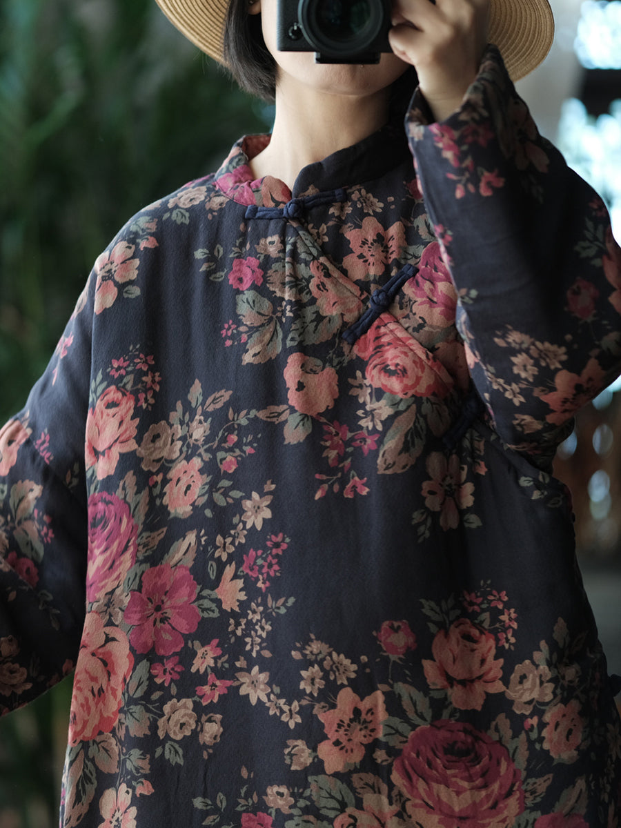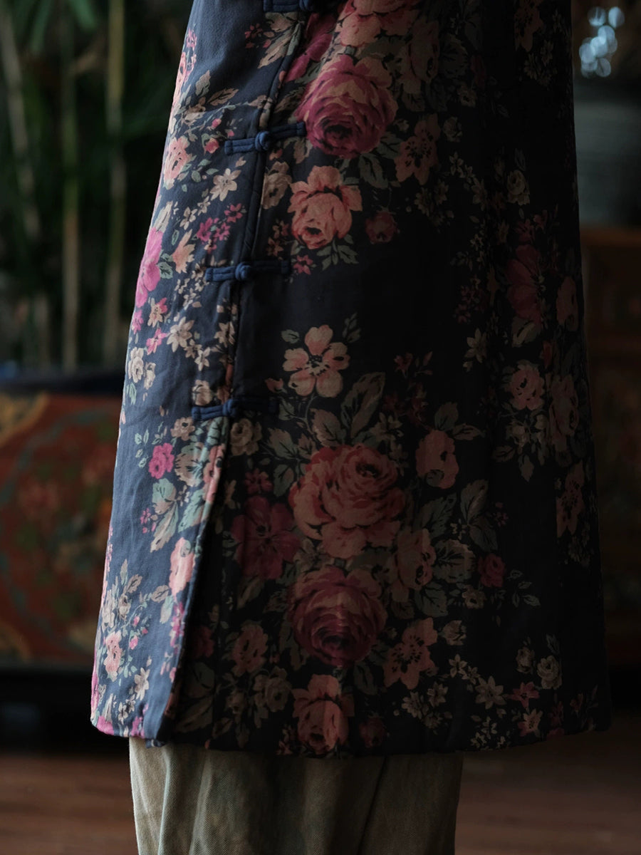Abrigo acolchado con cuello alto y flores retro de invierno para mujer