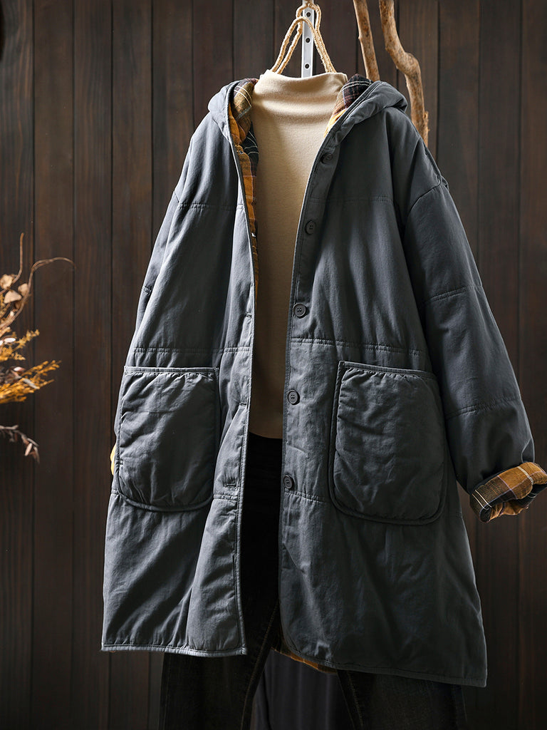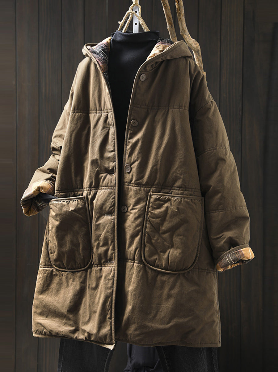 Este abrigo está diseñado con un patrón de cuadros y un cuello redondo, y está hecho de material de algodón. Las mangas raglán completas le dan un aspecto retro, lo que lo hace perfecto para las temporadas de invierno u otoño.