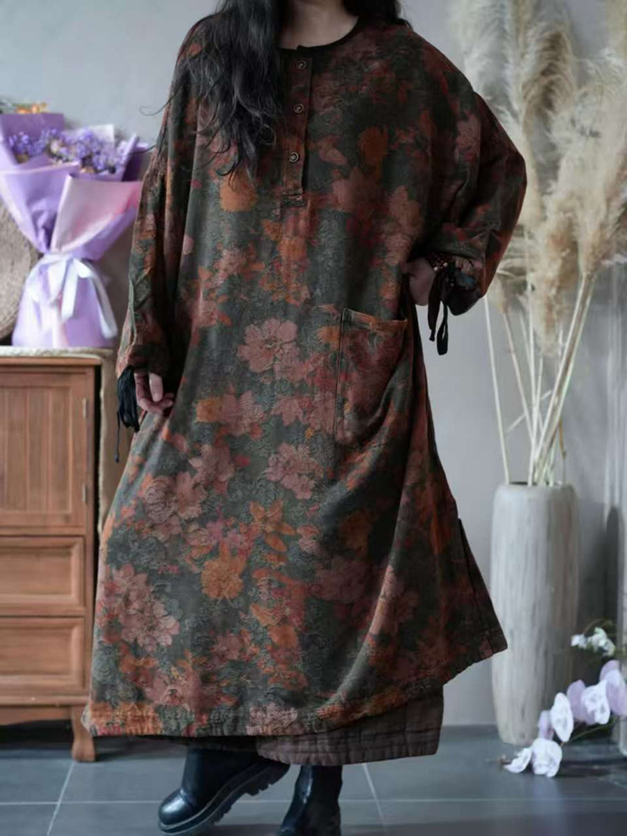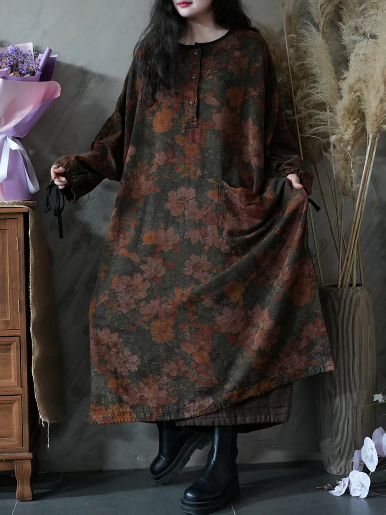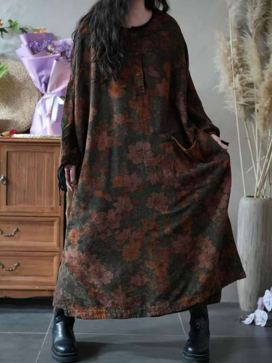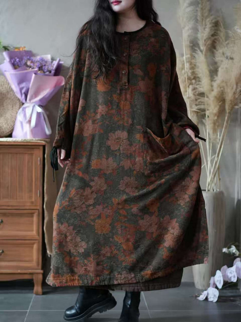Vestido de mujer estilo vintage otoñal con cuello redondo y estampado floral