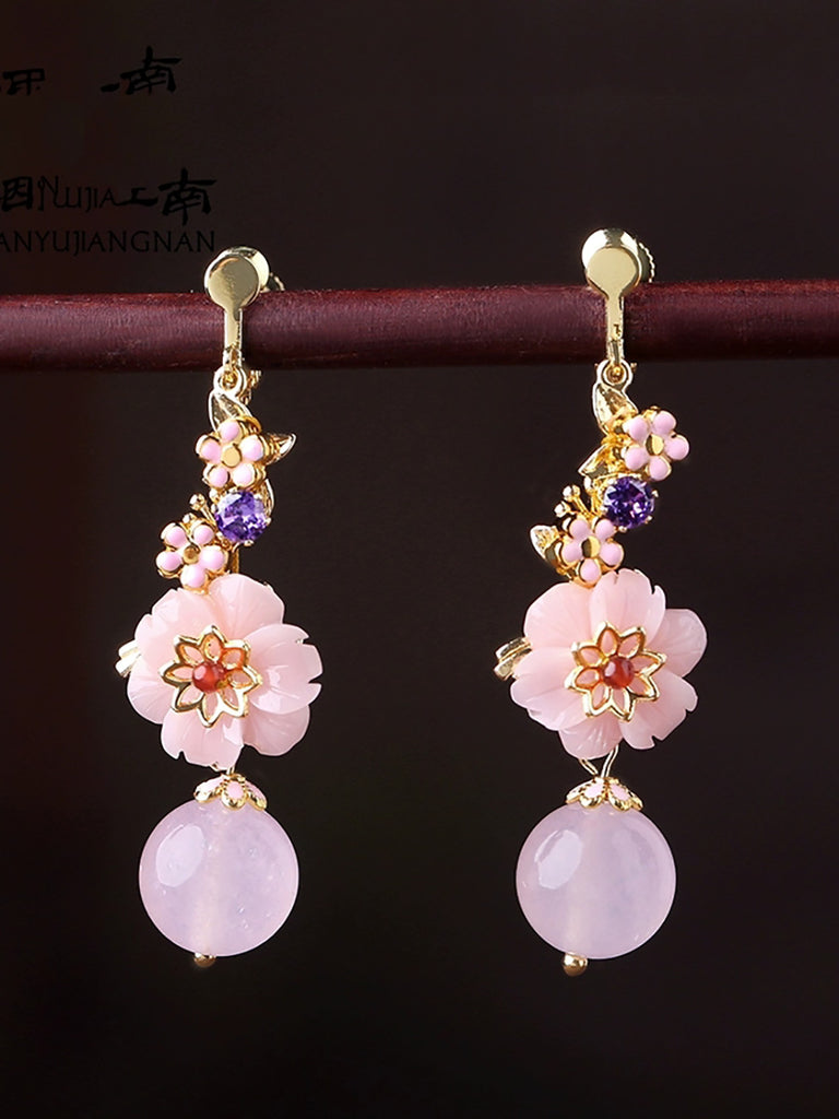 Pendientes vintage de plata con mangnolia y jade cloisonné con flores para mujer