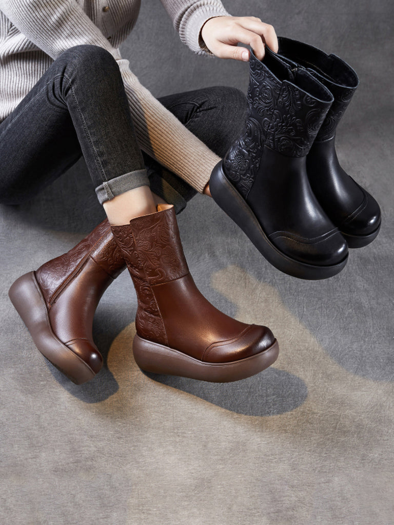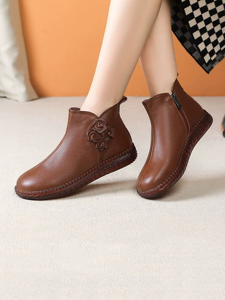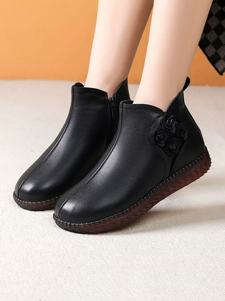 Botas de invierno vintage de piel con flores y forro polar para mujer