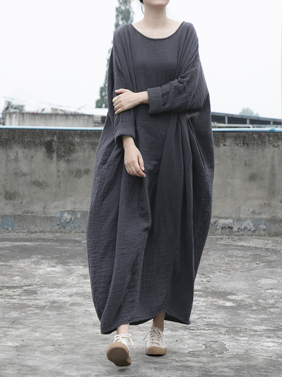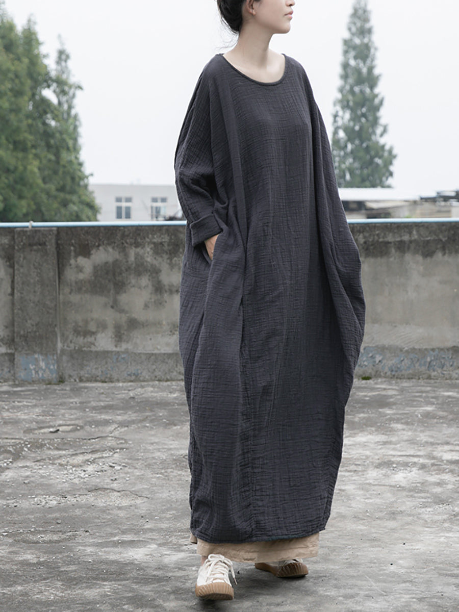 Este vestido, confeccionado por expertos en una mezcla de lino y algodón, presenta un patrón liso atemporal y presenta un cuello redondo y mangas raglán amplias. El estilo holgado y vintage agrega un toque relajado pero elegante a tu guardarropa. Ideal tanto para primavera como para otoño, este vestido es una prenda imprescindible para cualquier persona a la moda.