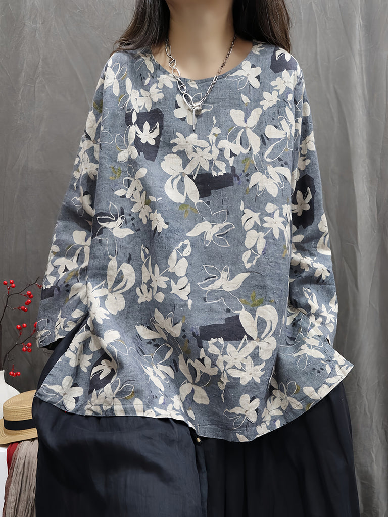 Camisa de lino 100 % con cuello redondo y estampado floral vintage de otoño para mujer