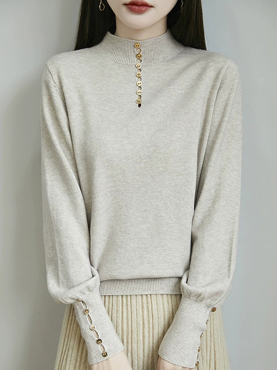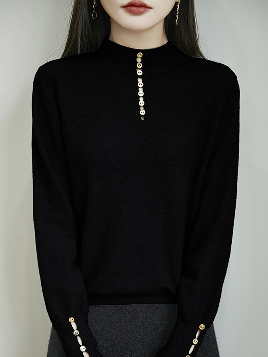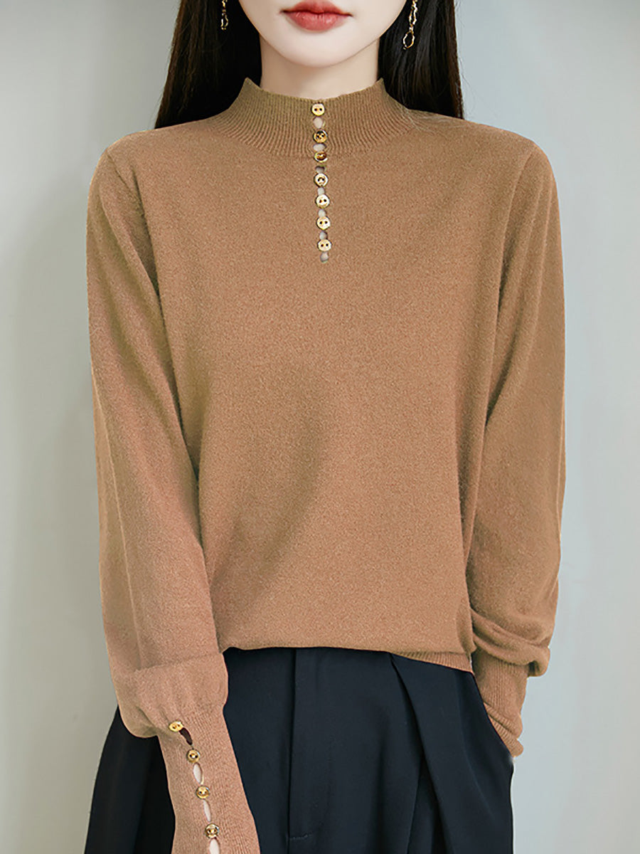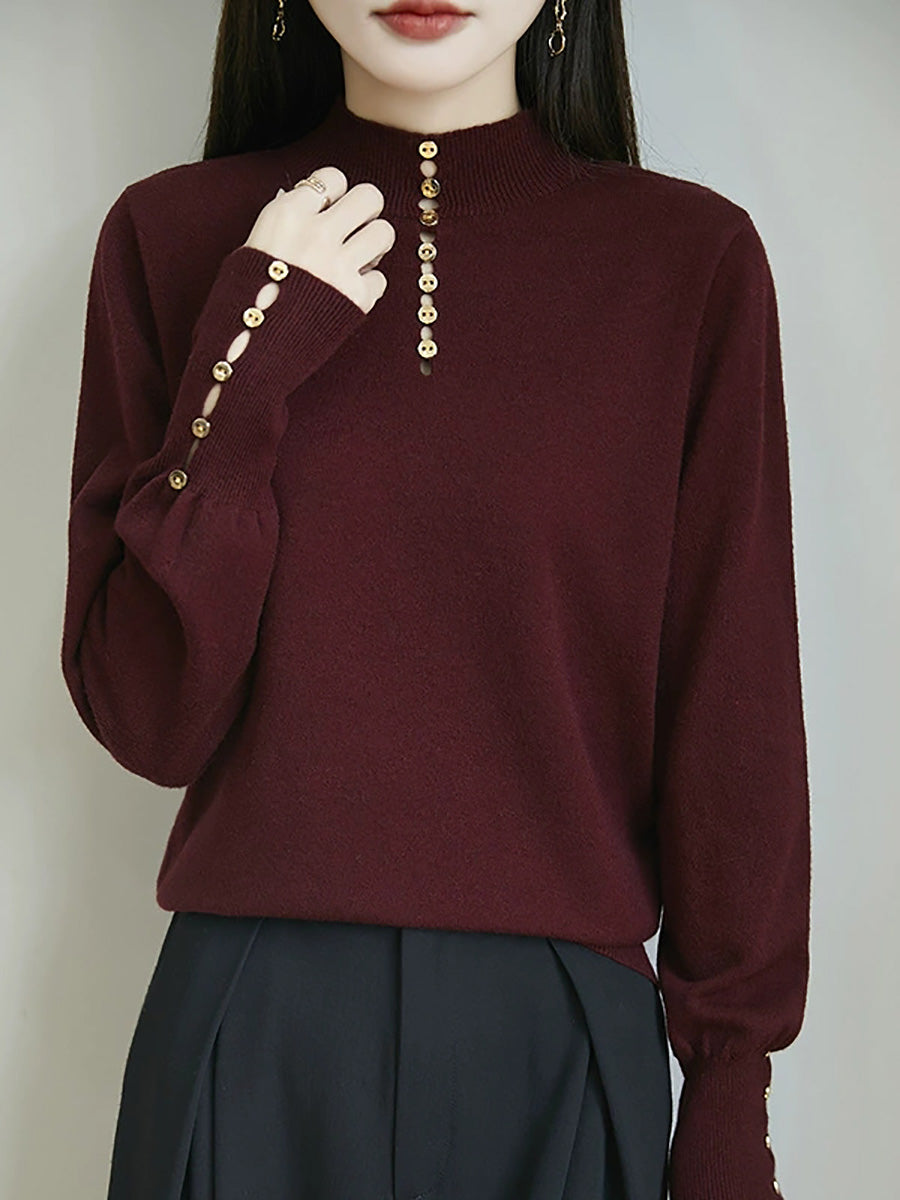 Suéter de cuello alto medio con botones de color puro y estilo artístico de otoño para mujer