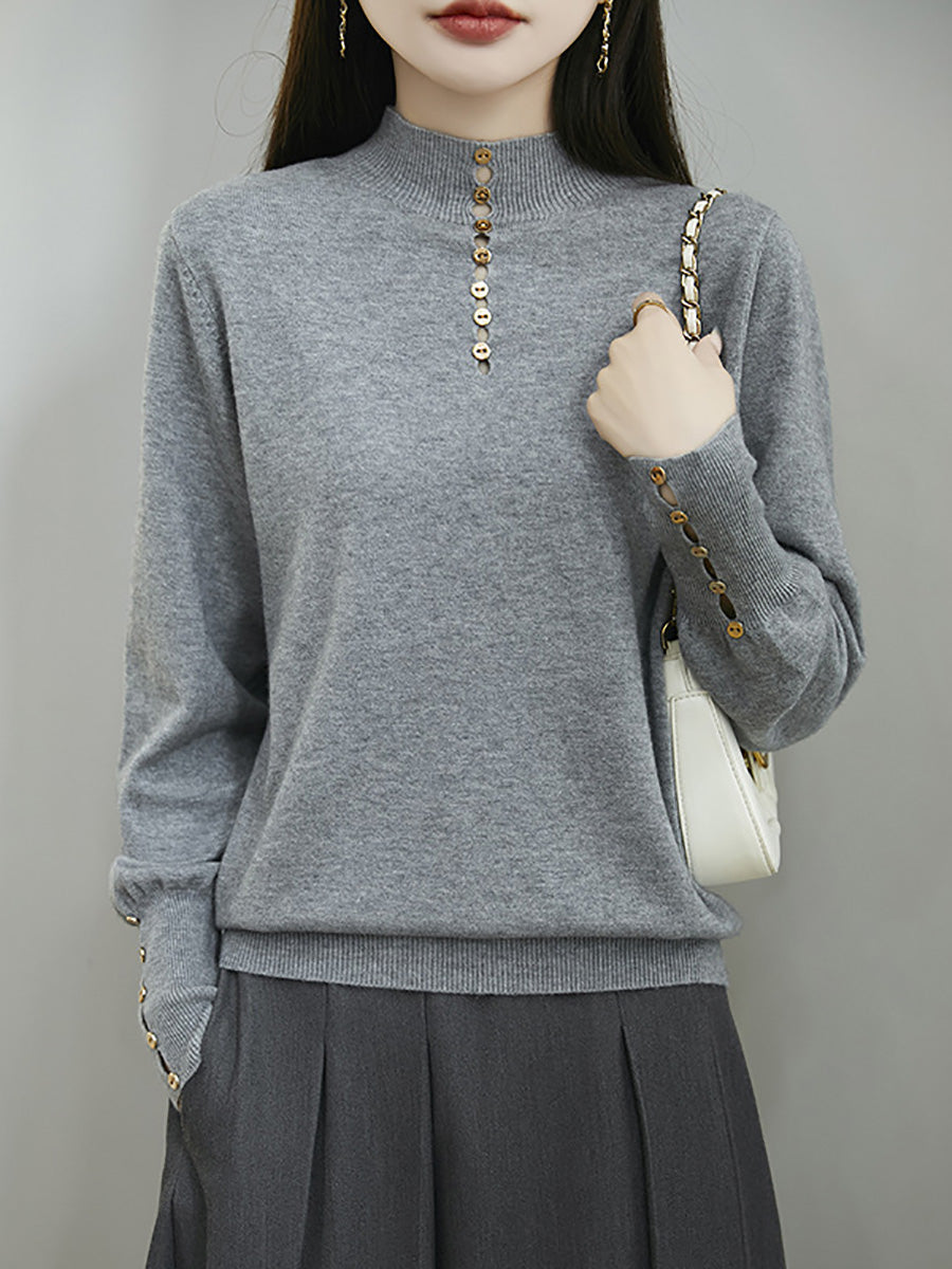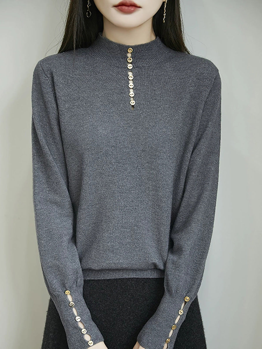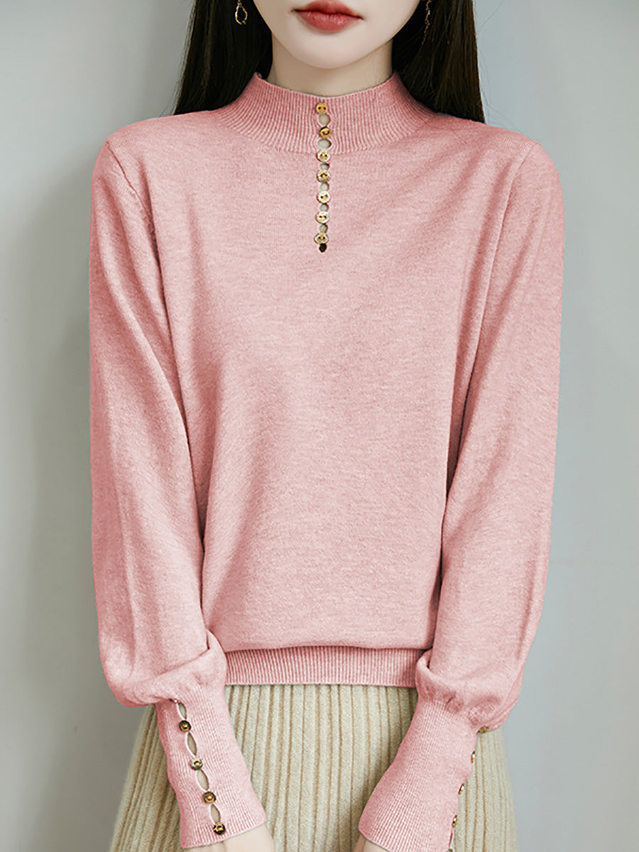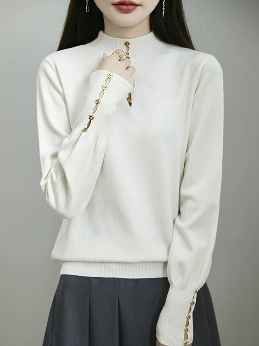 Suéter de cuello alto medio con botones de color puro y estilo artístico de otoño para mujer