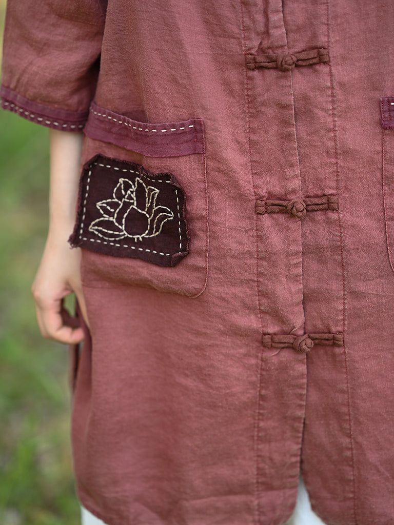 Camisa de verano para mujer, estilo retro, con cuello alto y parche de loto, 100 % lino