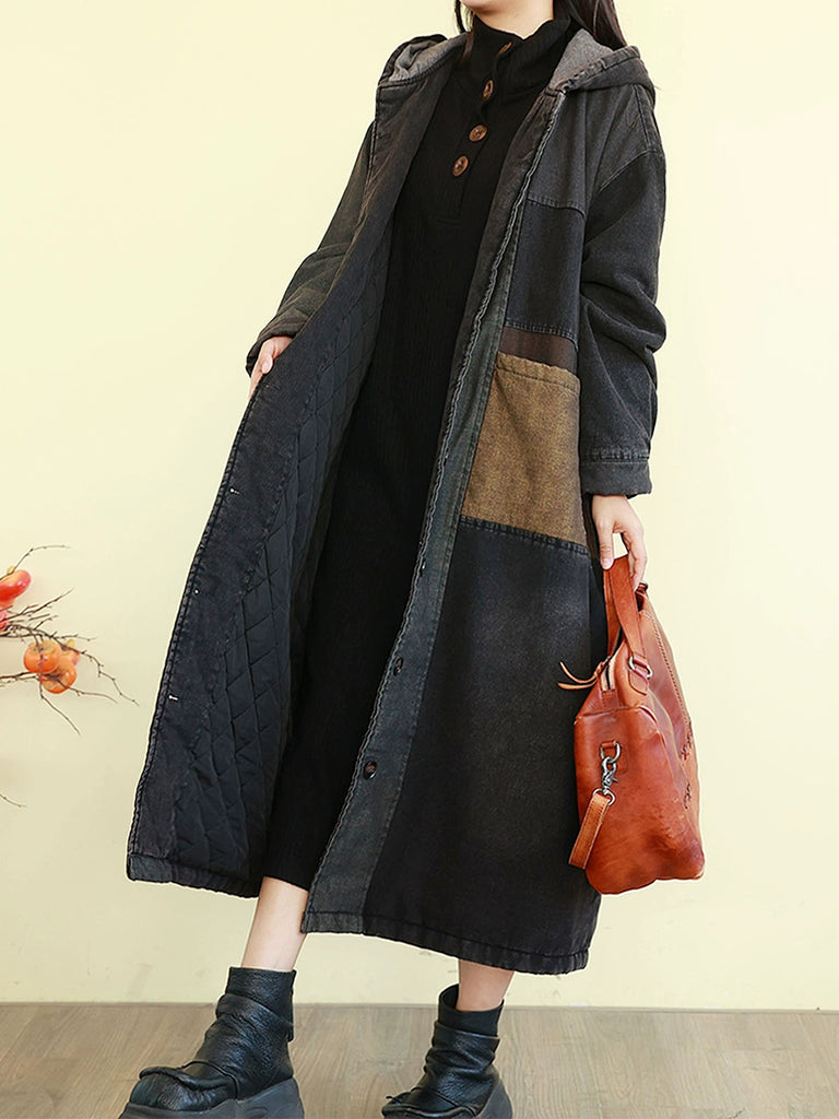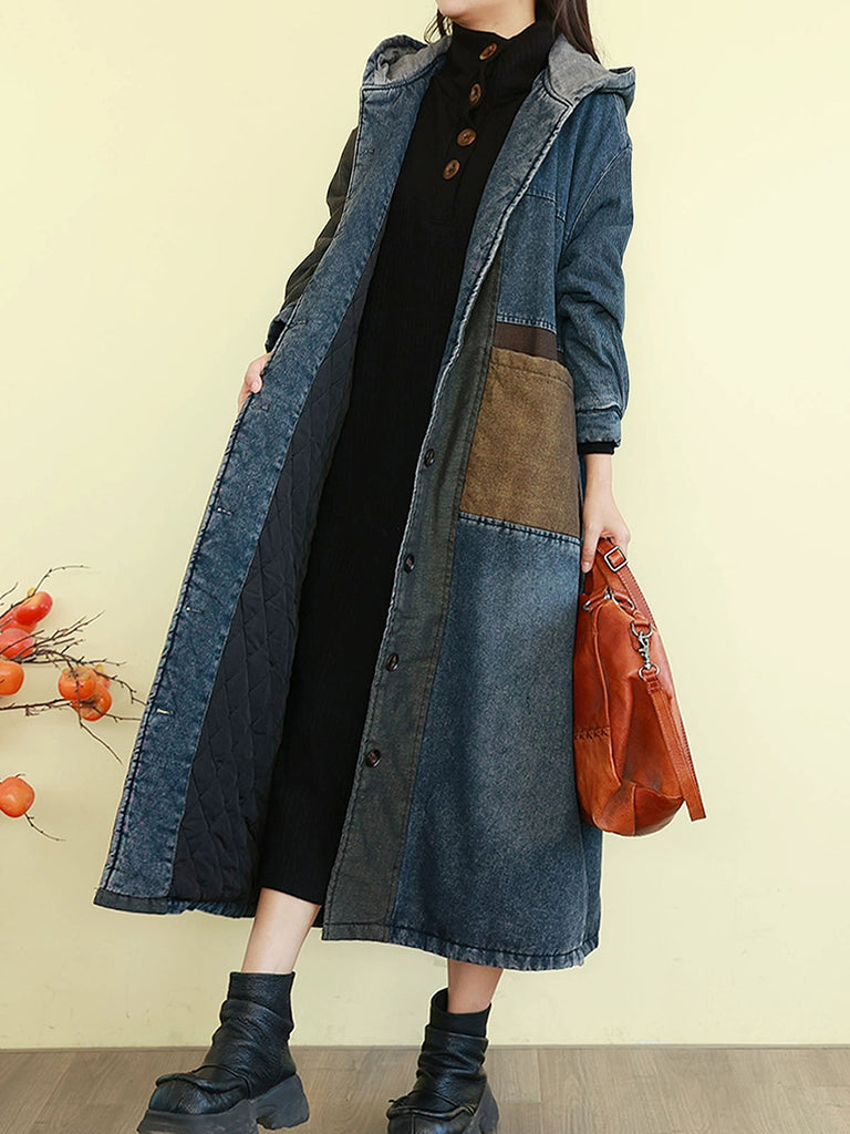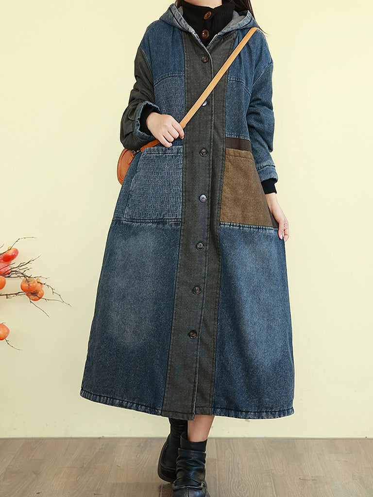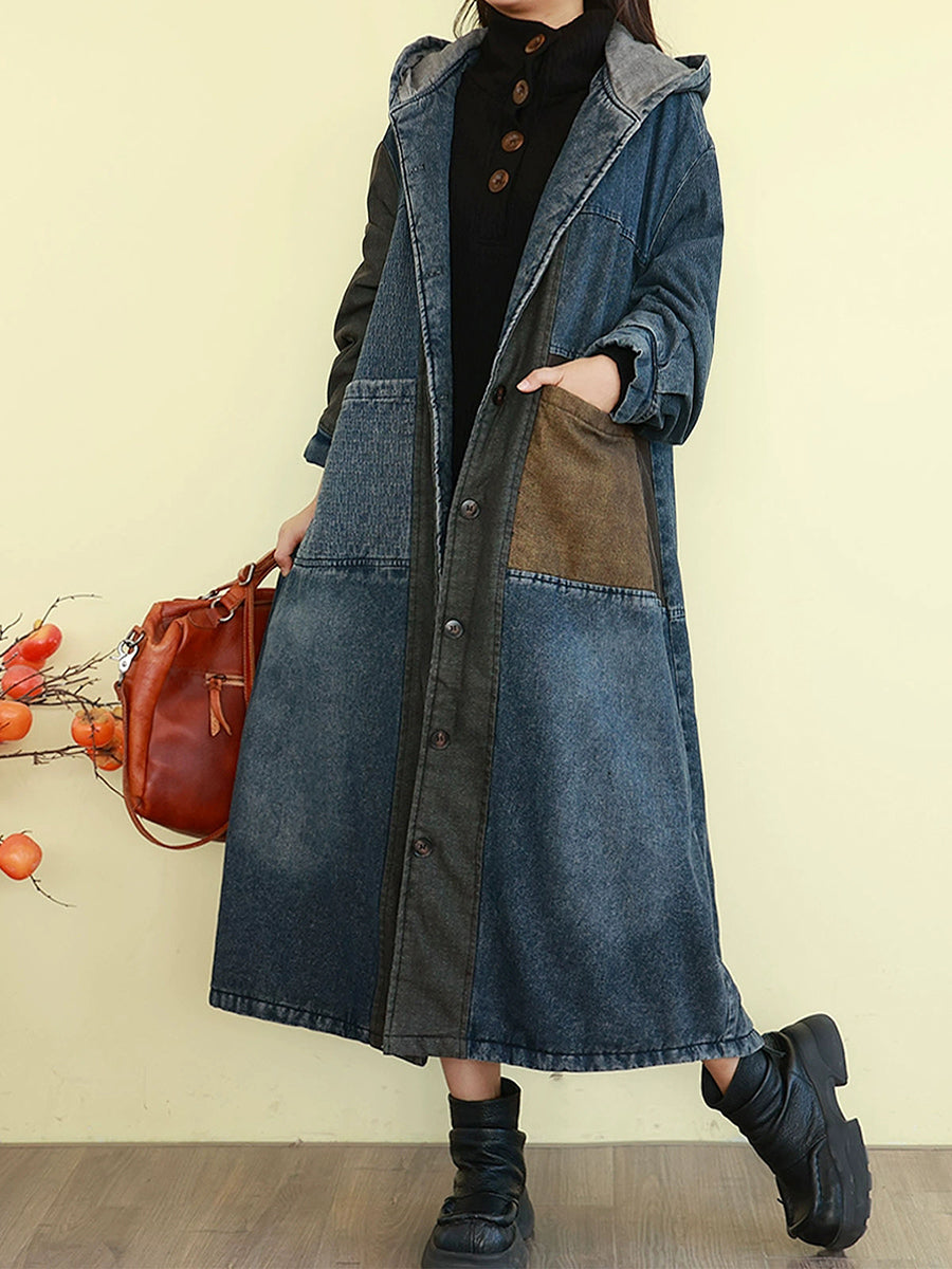 Abrigo acolchado con capucha y diseño de bloques de color retro de mezclilla para mujer