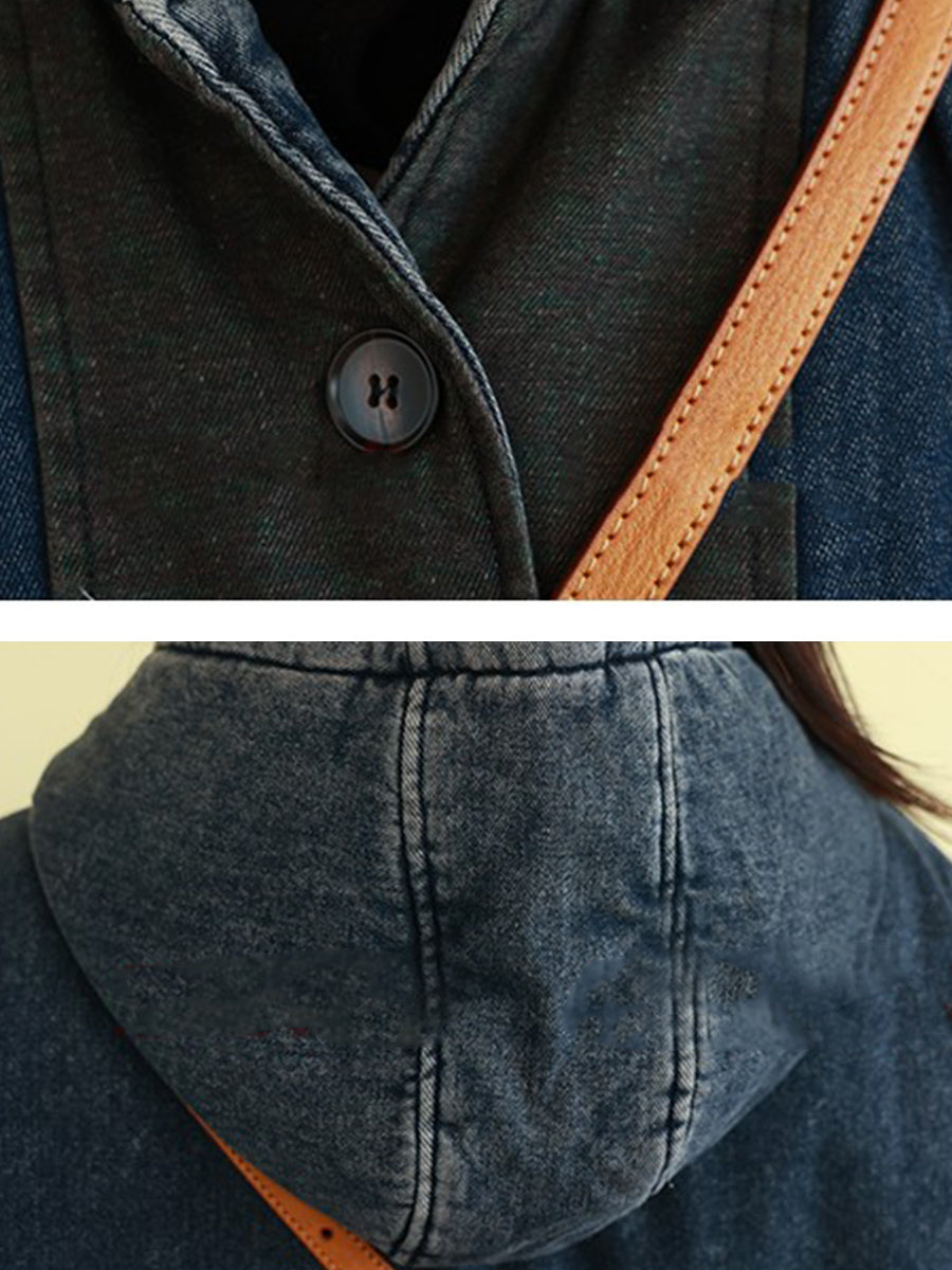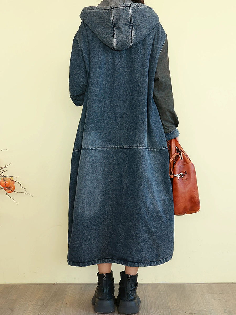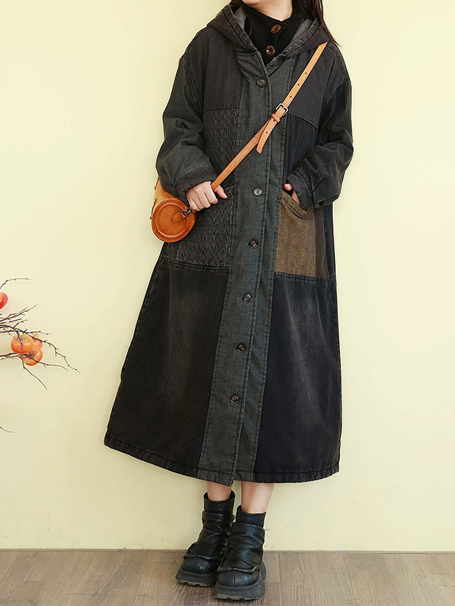 Abrigo acolchado con capucha y diseño de bloques de color retro de mezclilla para mujer