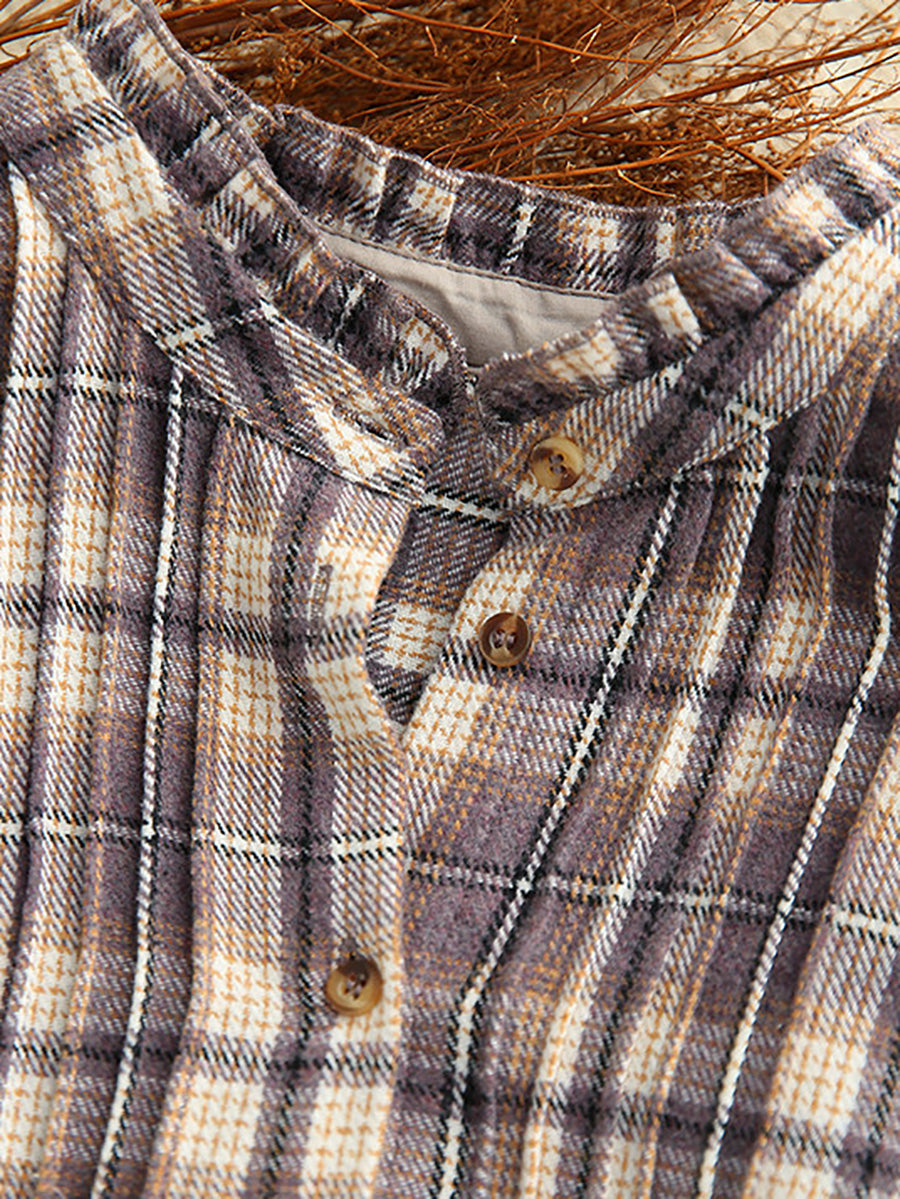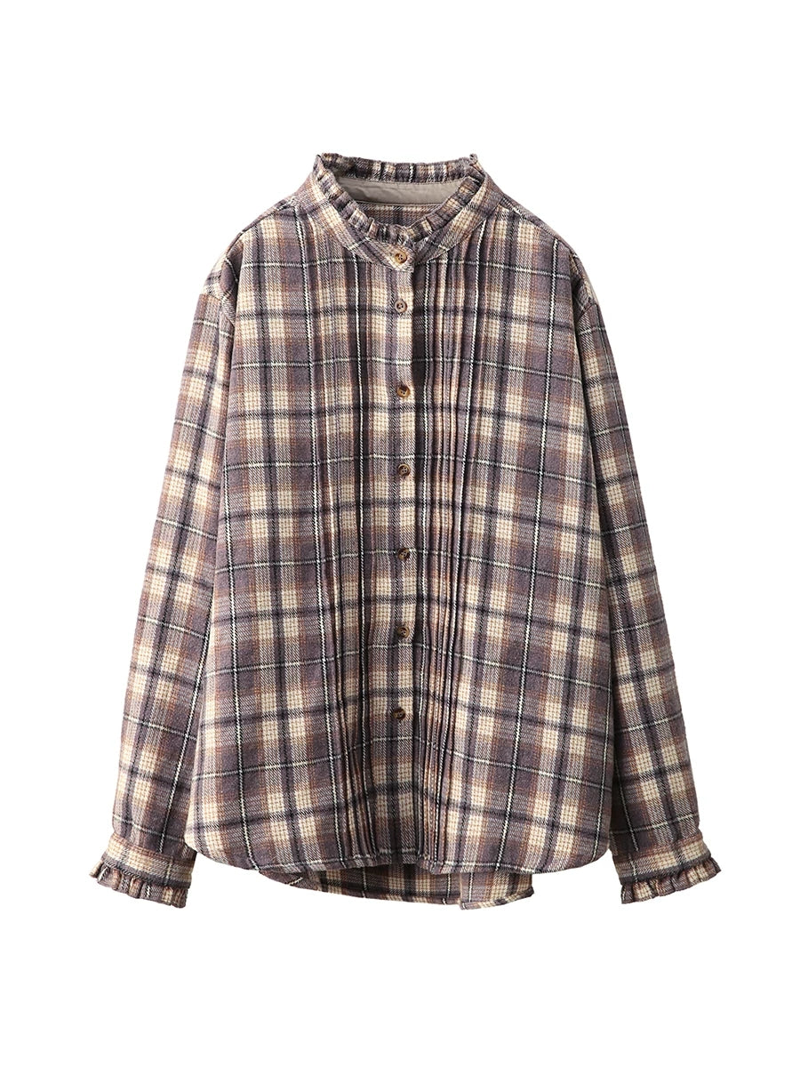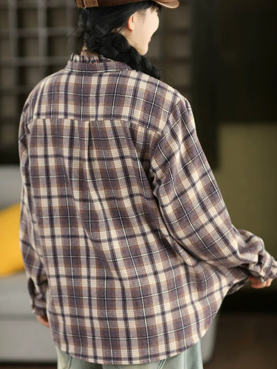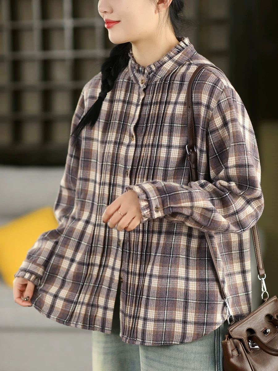 Camisa vintage a cuadros con cuello vuelto para mujer de primavera