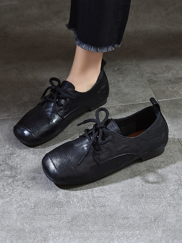 Zapatos vintage de piel auténtica con punta cuadrada y tacón bajo para mujer