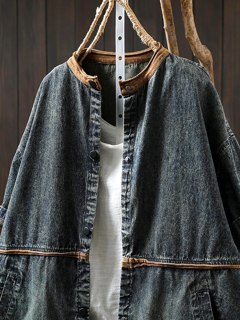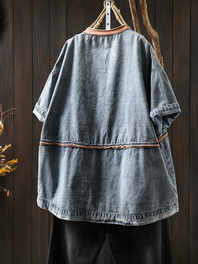Camisa vaquera informal de verano con cuello redondo y bloques de color para mujer