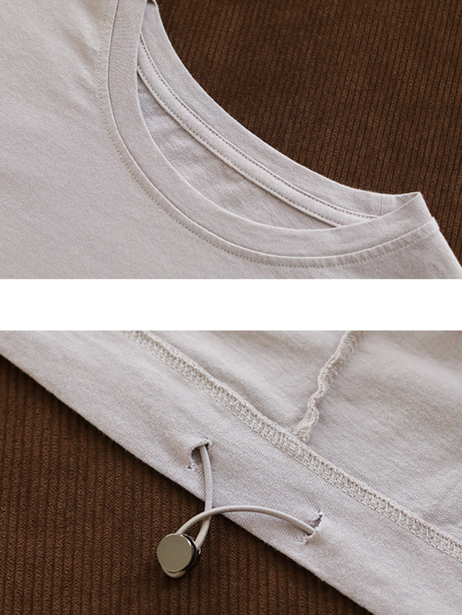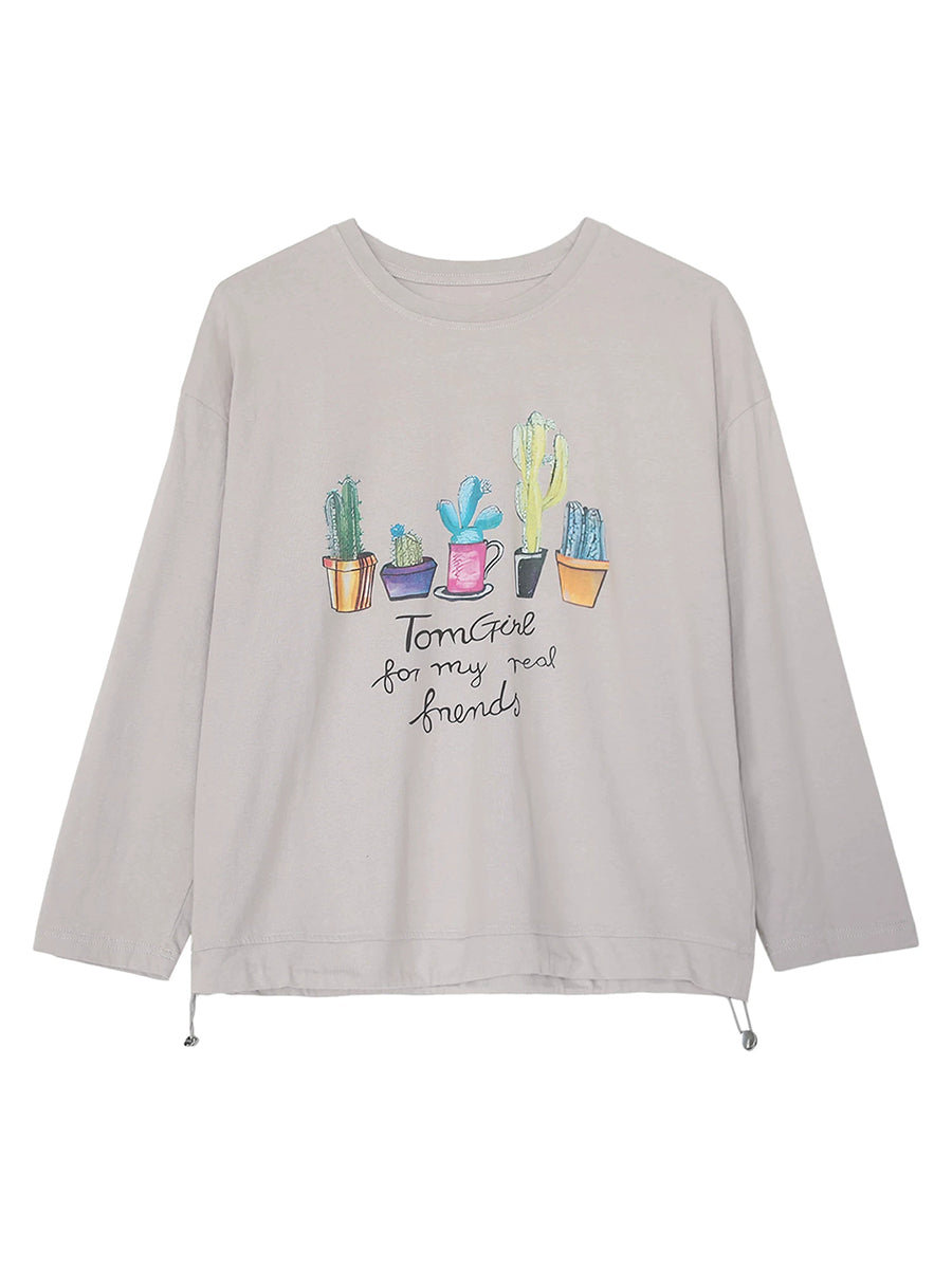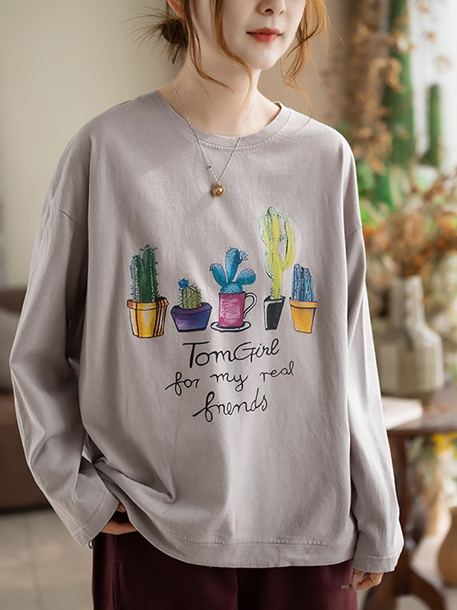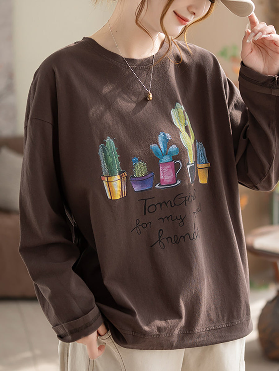 Blusa de algodón con cuello redondo y estampado de plantas artísticas de primavera para mujer