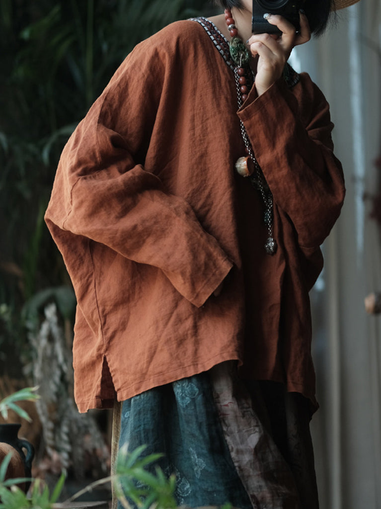 Camisa de lino con cuello en V y bordado retro de otoño para mujer