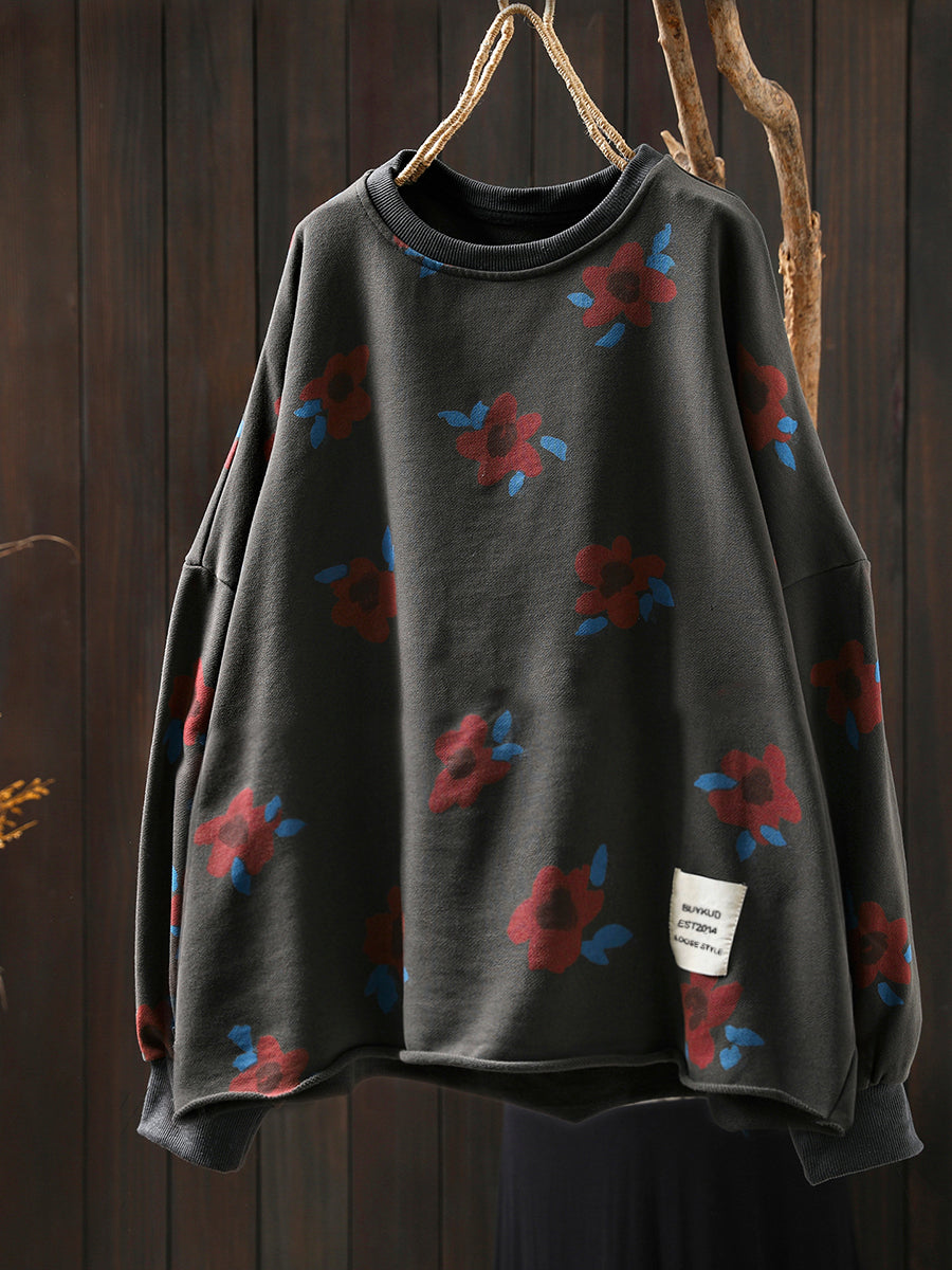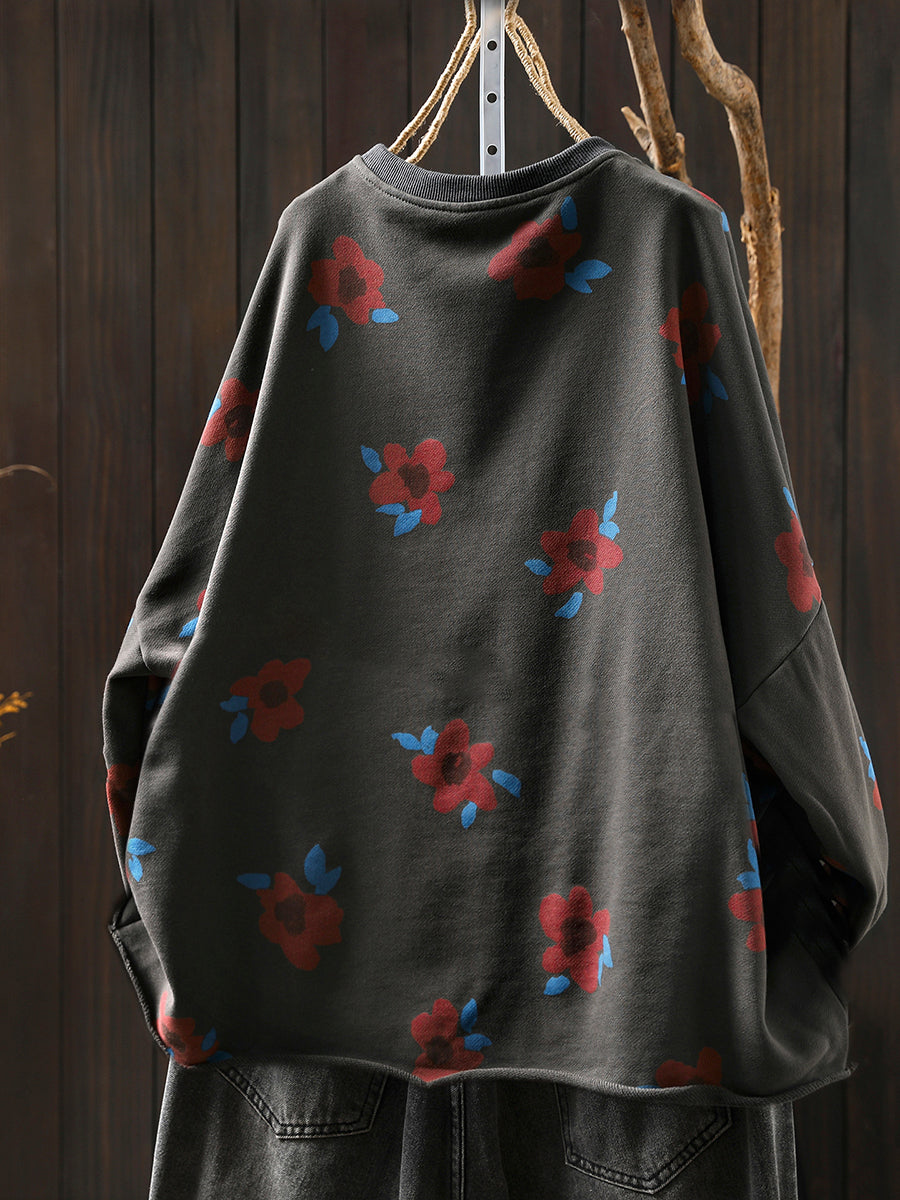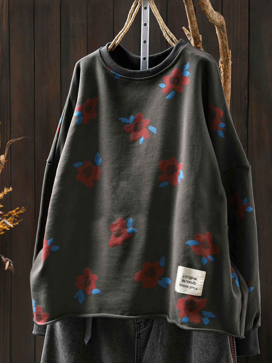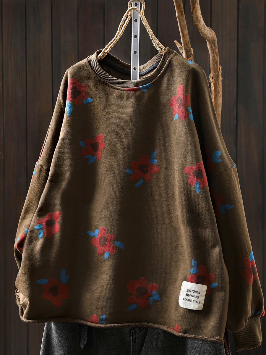 Blusa de algodón con cuello redondo y flores artísticas de otoño para mujer