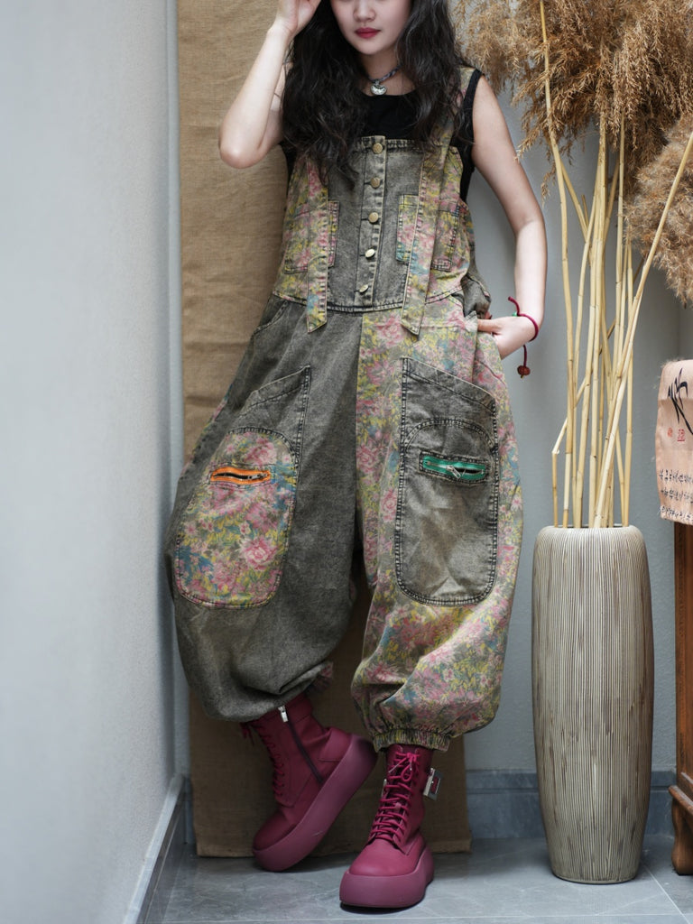 Women Summer Retro Flower Patch Spliced Denim Jumpsuits
