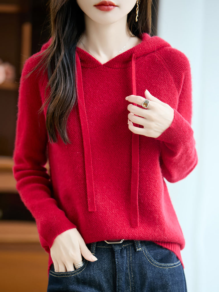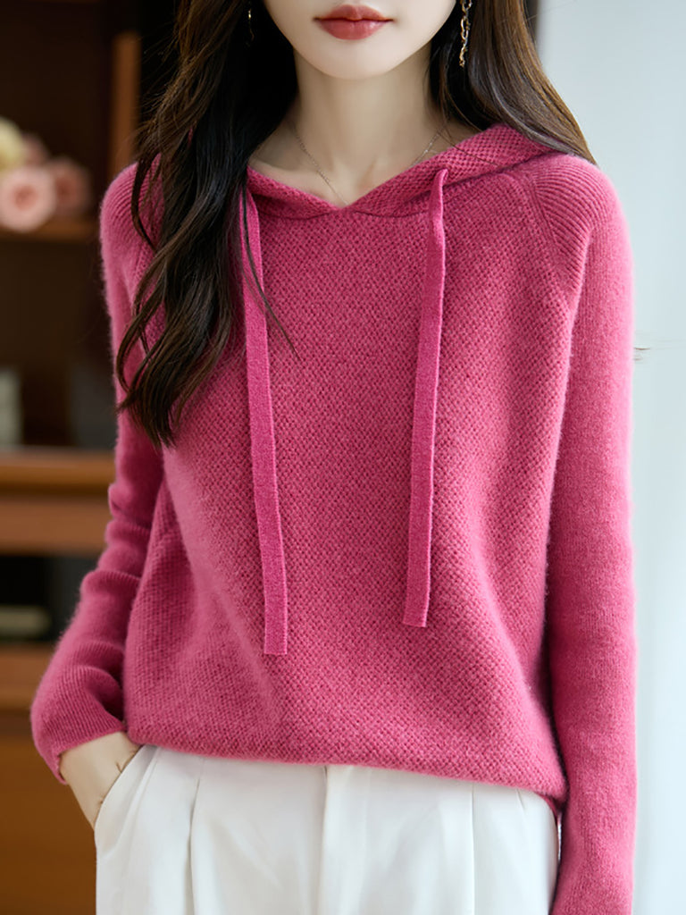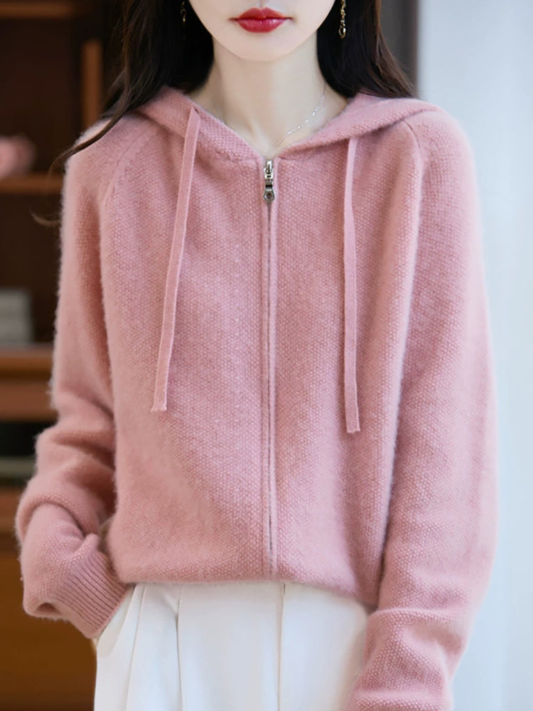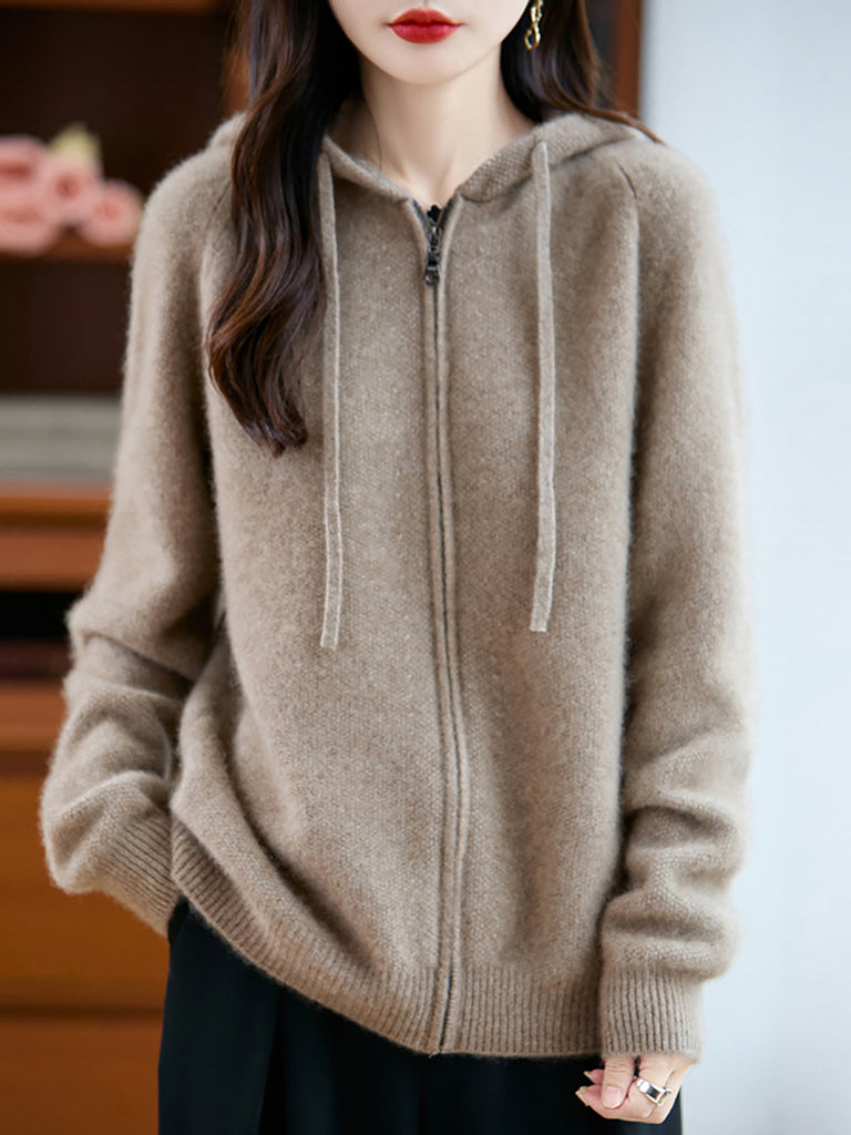 Women Autumn Pure Color Wool Hooded Cardigan Sweater