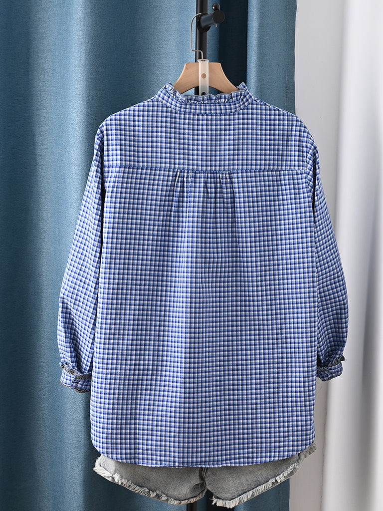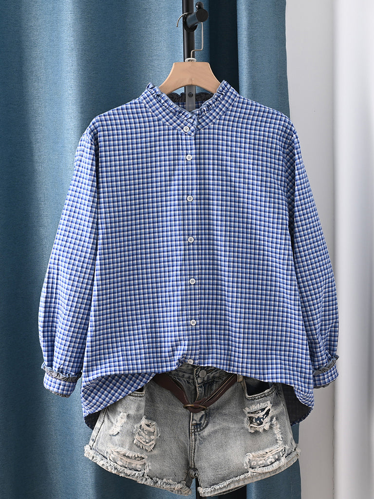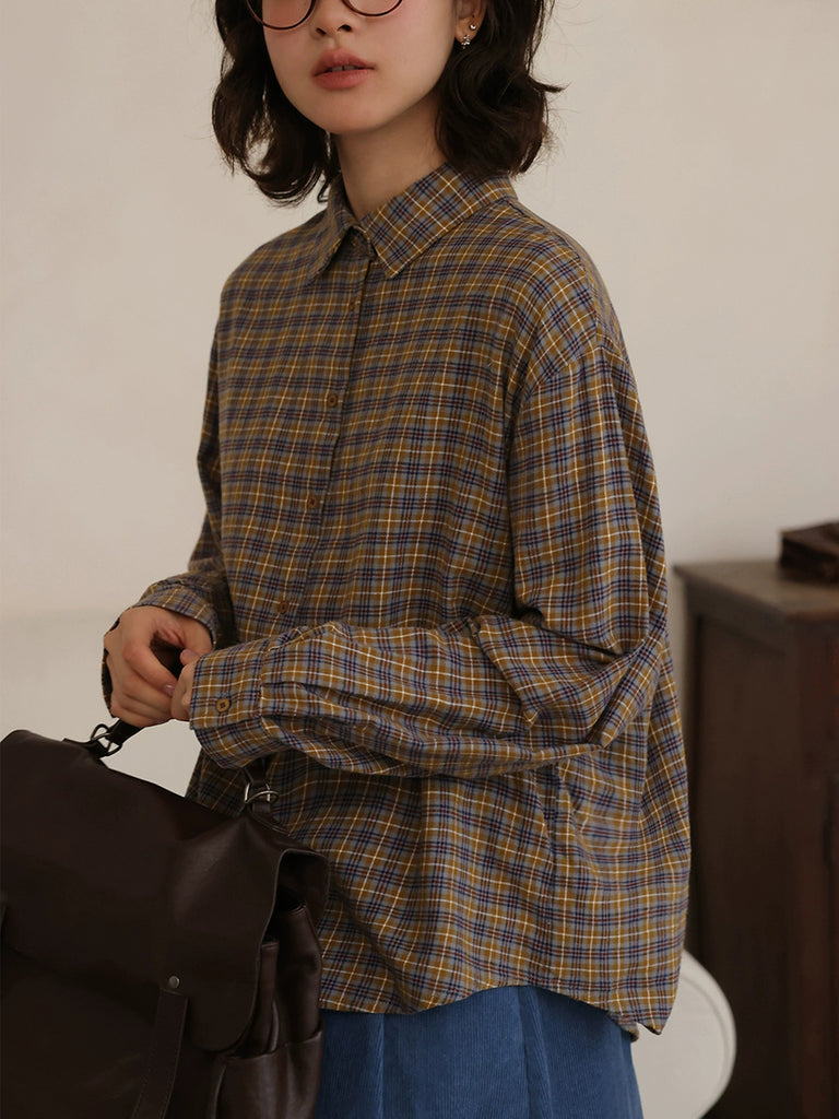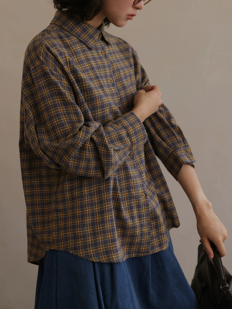Women Artsy Plaid 100%Cotton Turn-down Collar Shirt