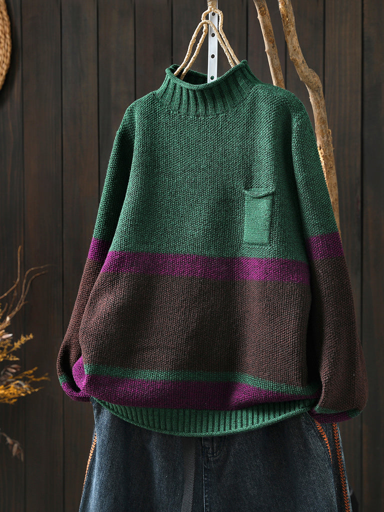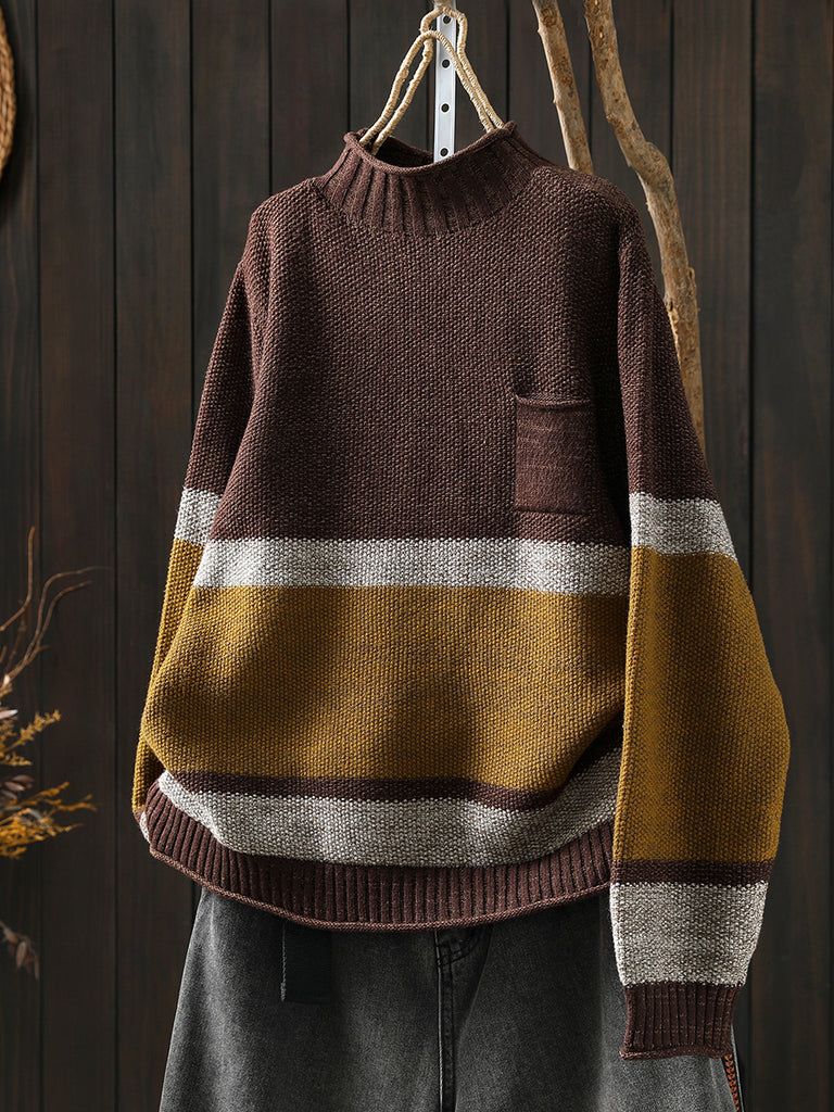 Women Autumn Artsy Colorblock Knitted Half-Turtleneck Sweater