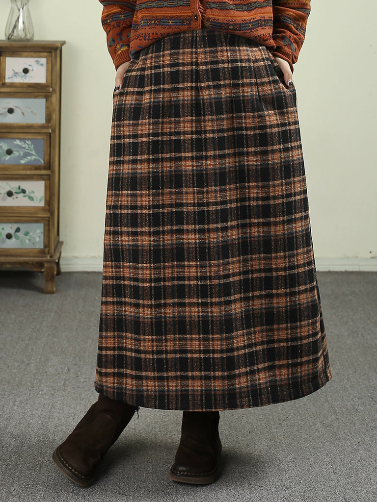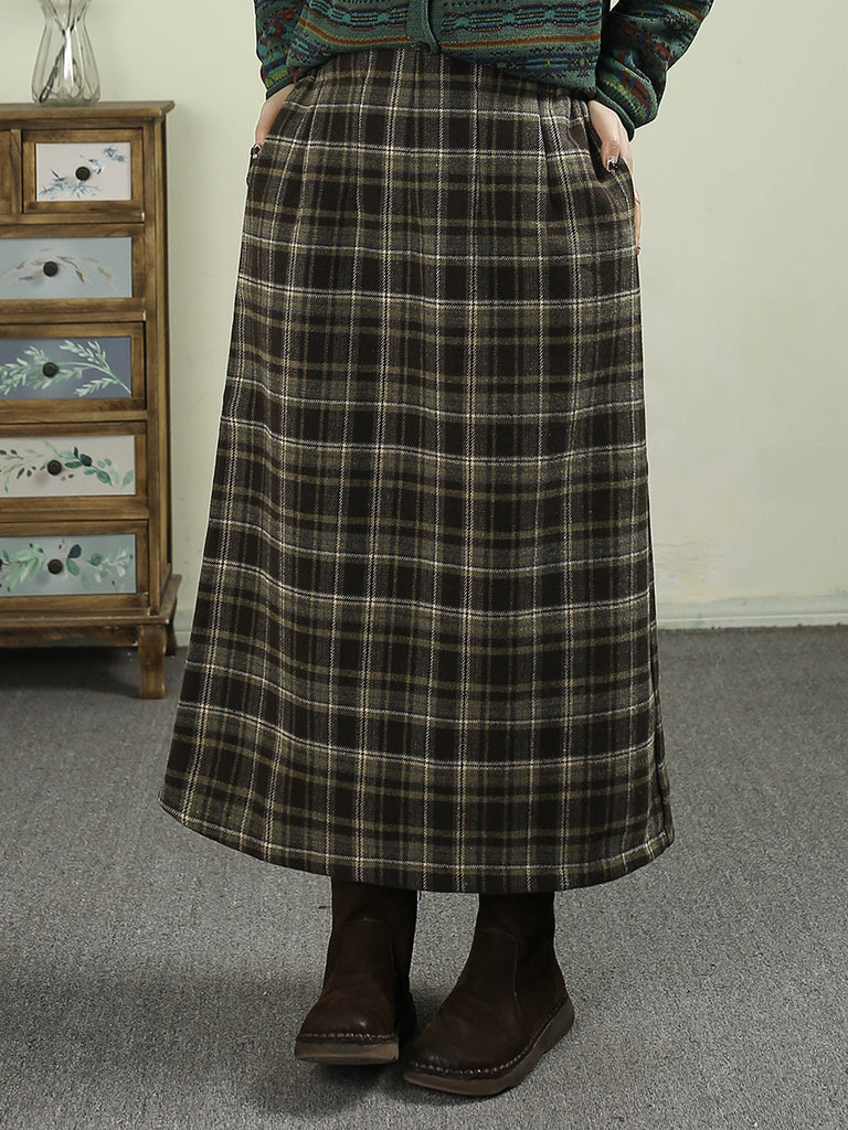 Women Winter Fleece-lined Plaid A-Shape Skirt