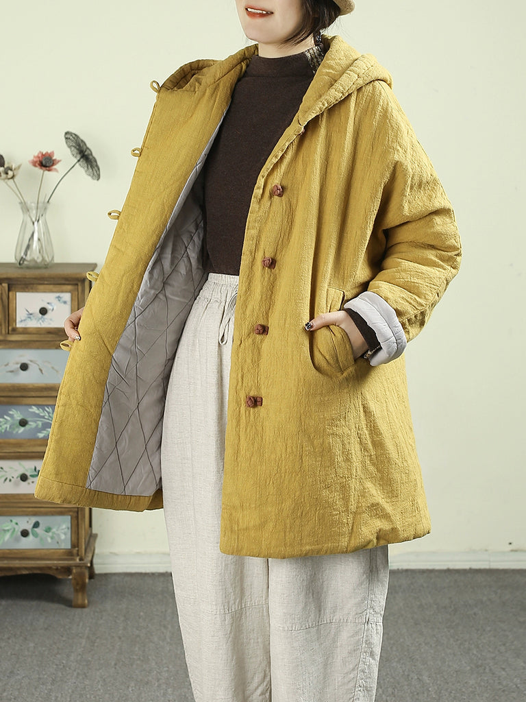 Women Winter Retro Pure Color 100%Linen Hooded Coat