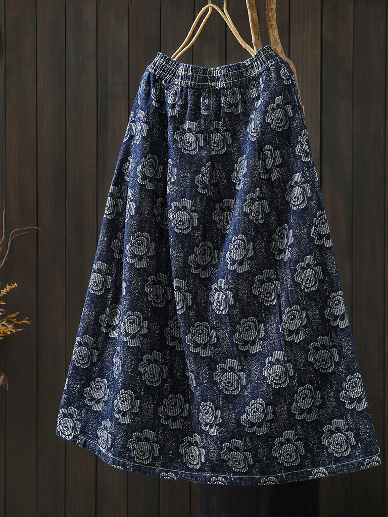 Women Winter Floral Embroidery 100%Cotton A-Shape Skirt