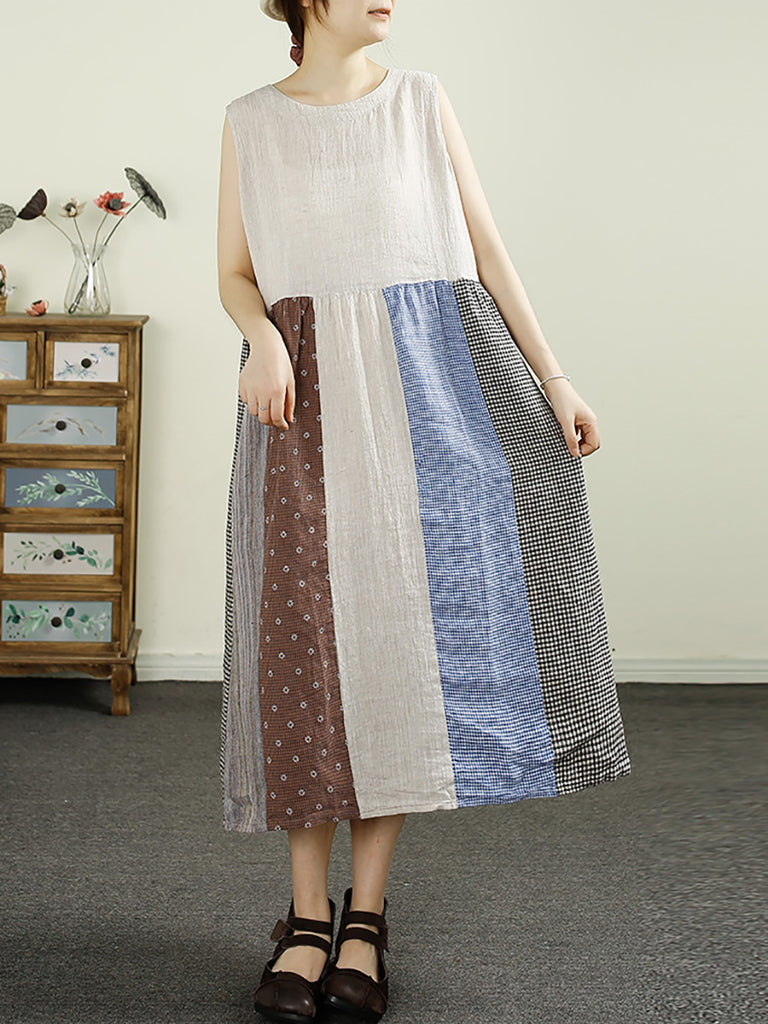 Plus Size Women Summer Plaid Spliced 100%Linen Vest Dress