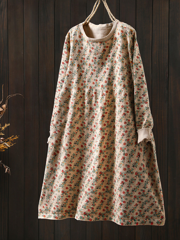 Women Autumn Artsy Floral Cotton O-Neck Knitted Dress