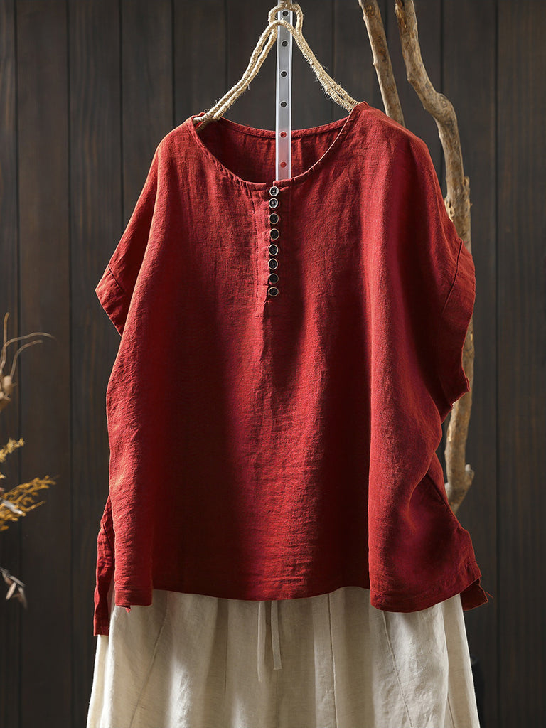 Plus Size Women Summer Casual Pure Color O-Neck 100%Linen Shirt