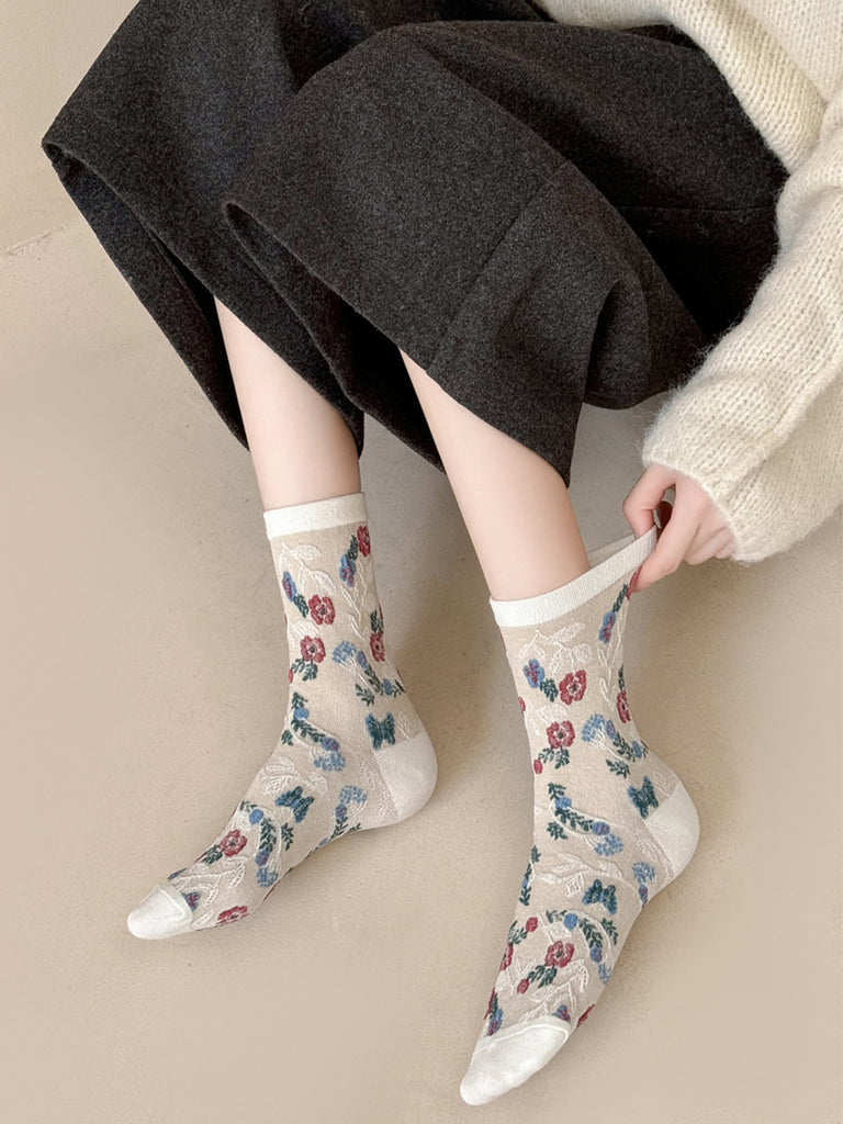 5 Pairs Women Autumn Artsy Floral Jacquard Socks