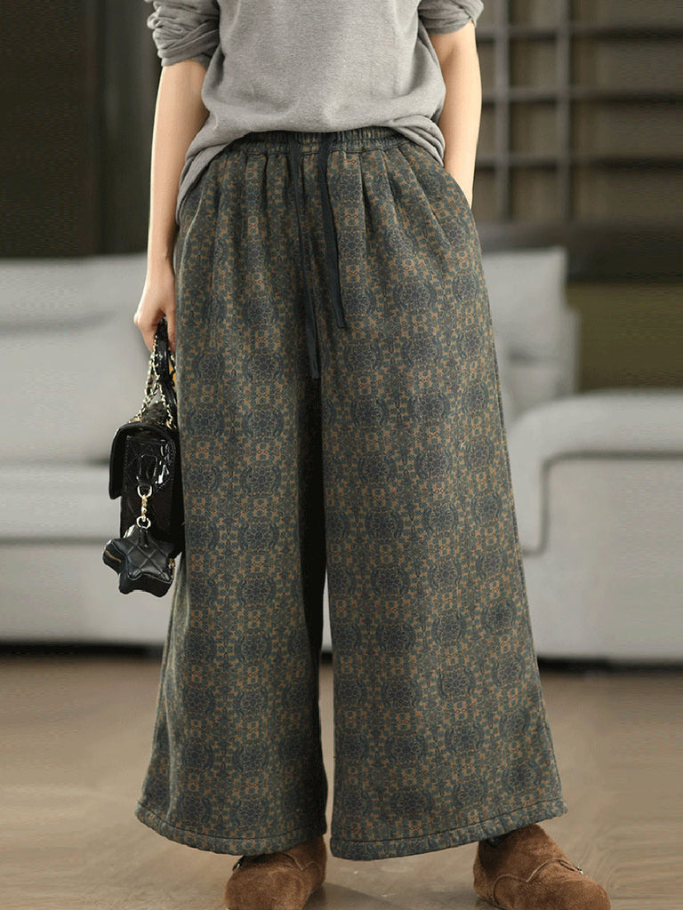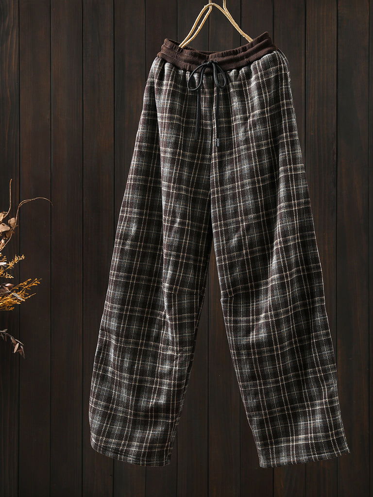 Women Winter Retro Plaid Fleece-lined Wide-leg Pants