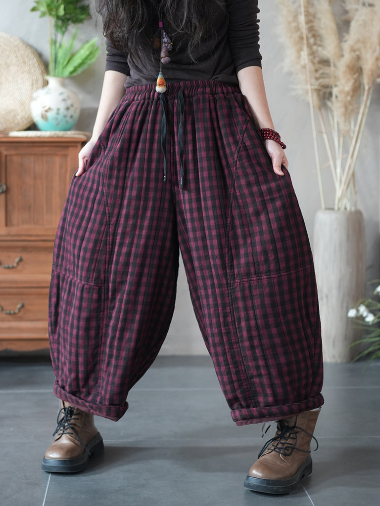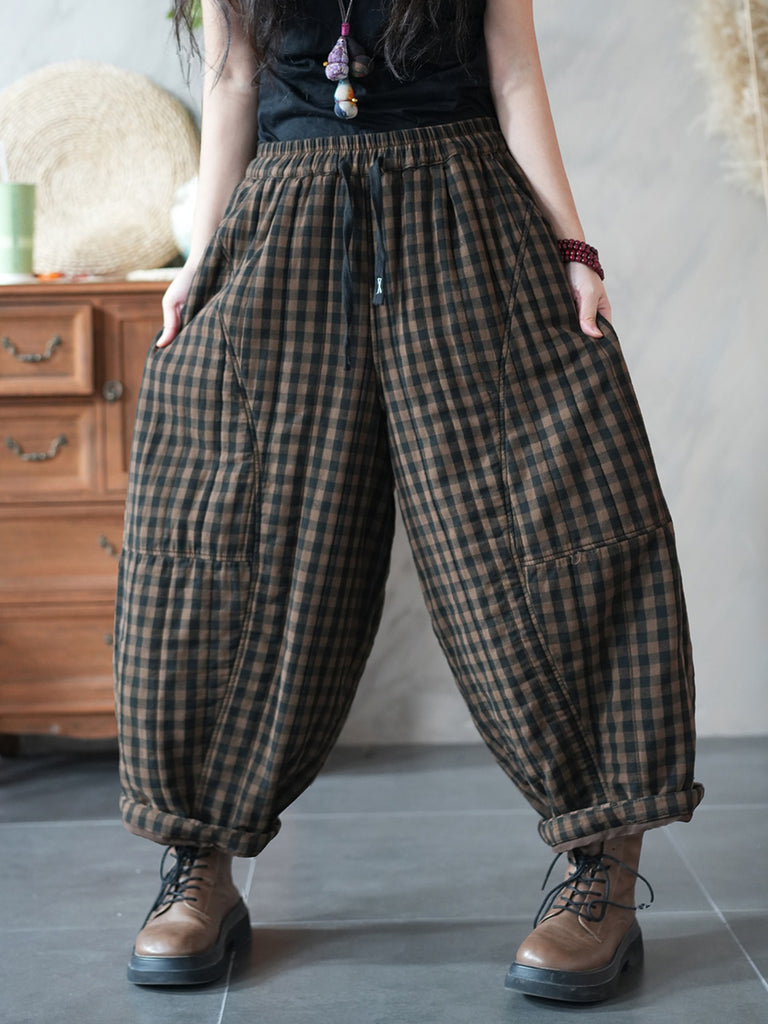 Women Winter Retro Plaid Fleece-lined Harem Pants