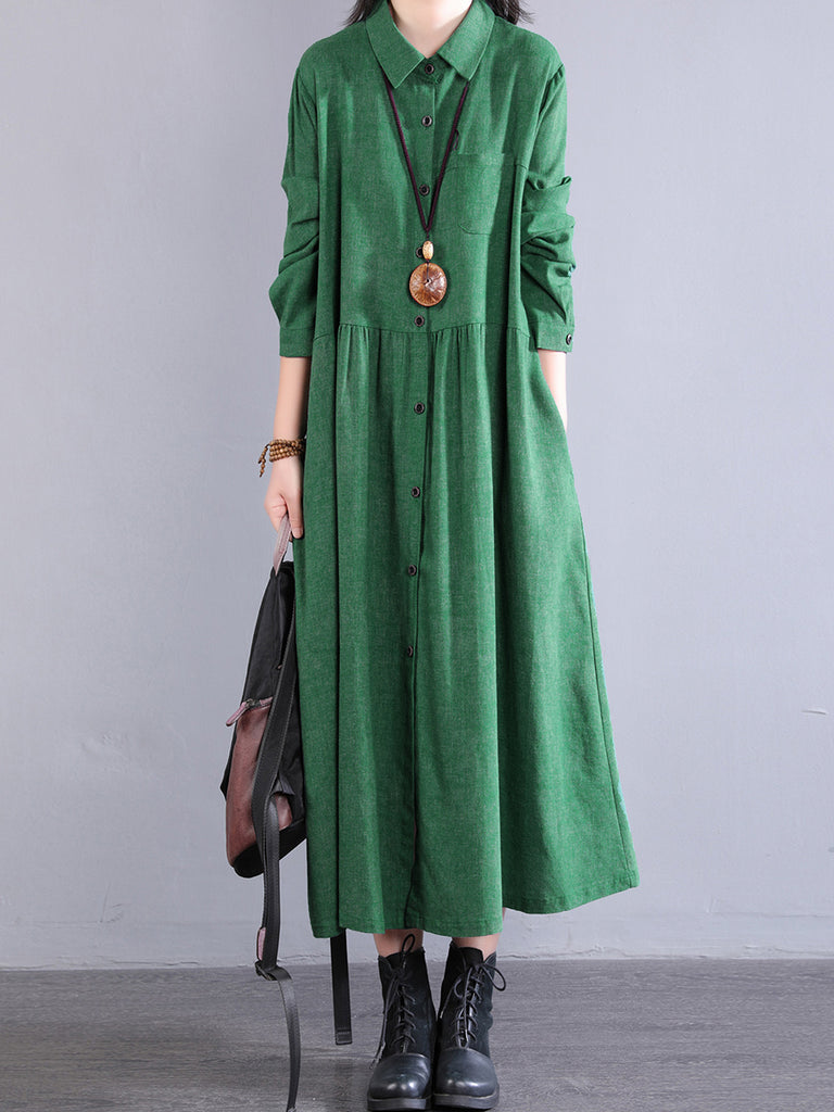 Women Autumn Pure Color Turn-down Collar 100%Cotton Dress