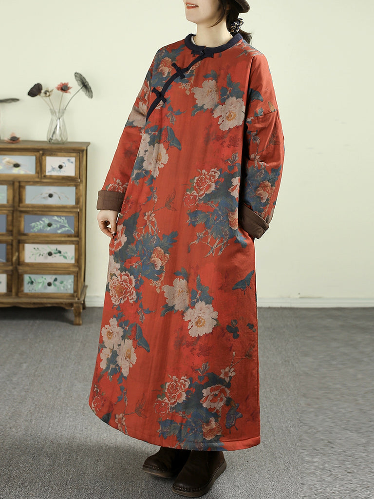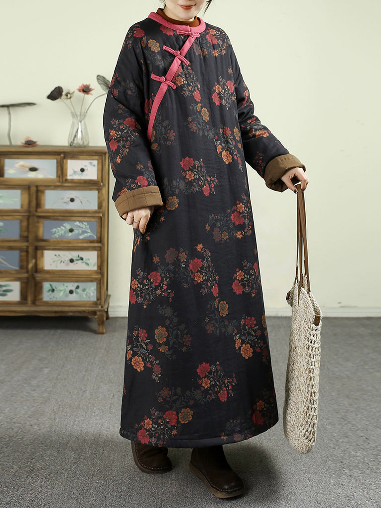 Women Winter Retro Flower Stand Collar Padded Robe Coat