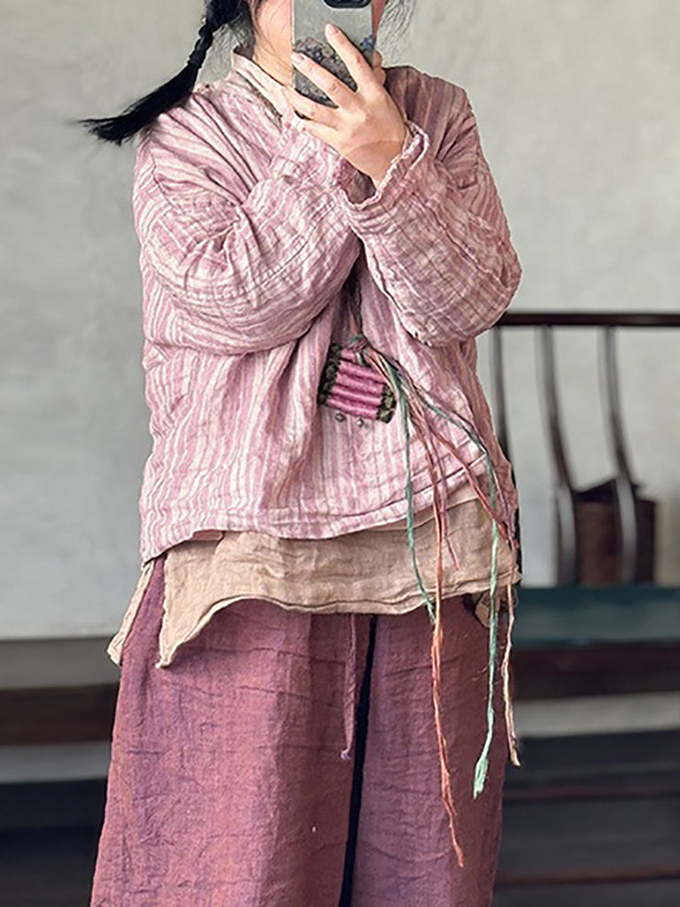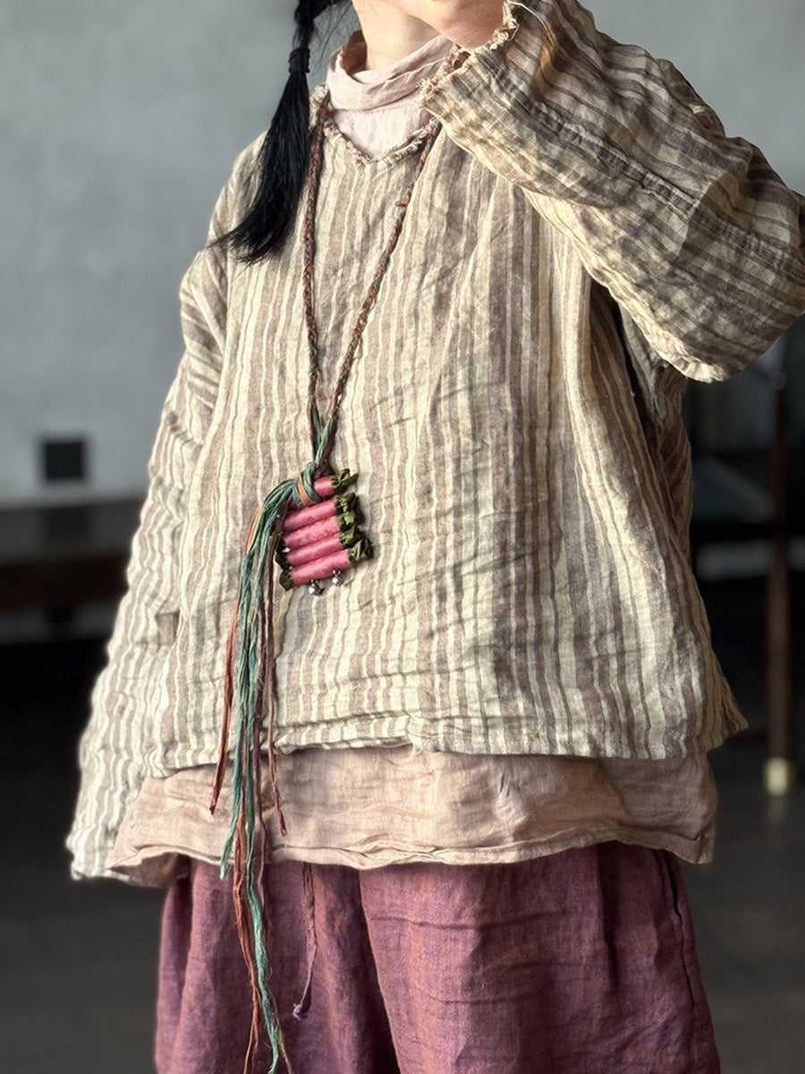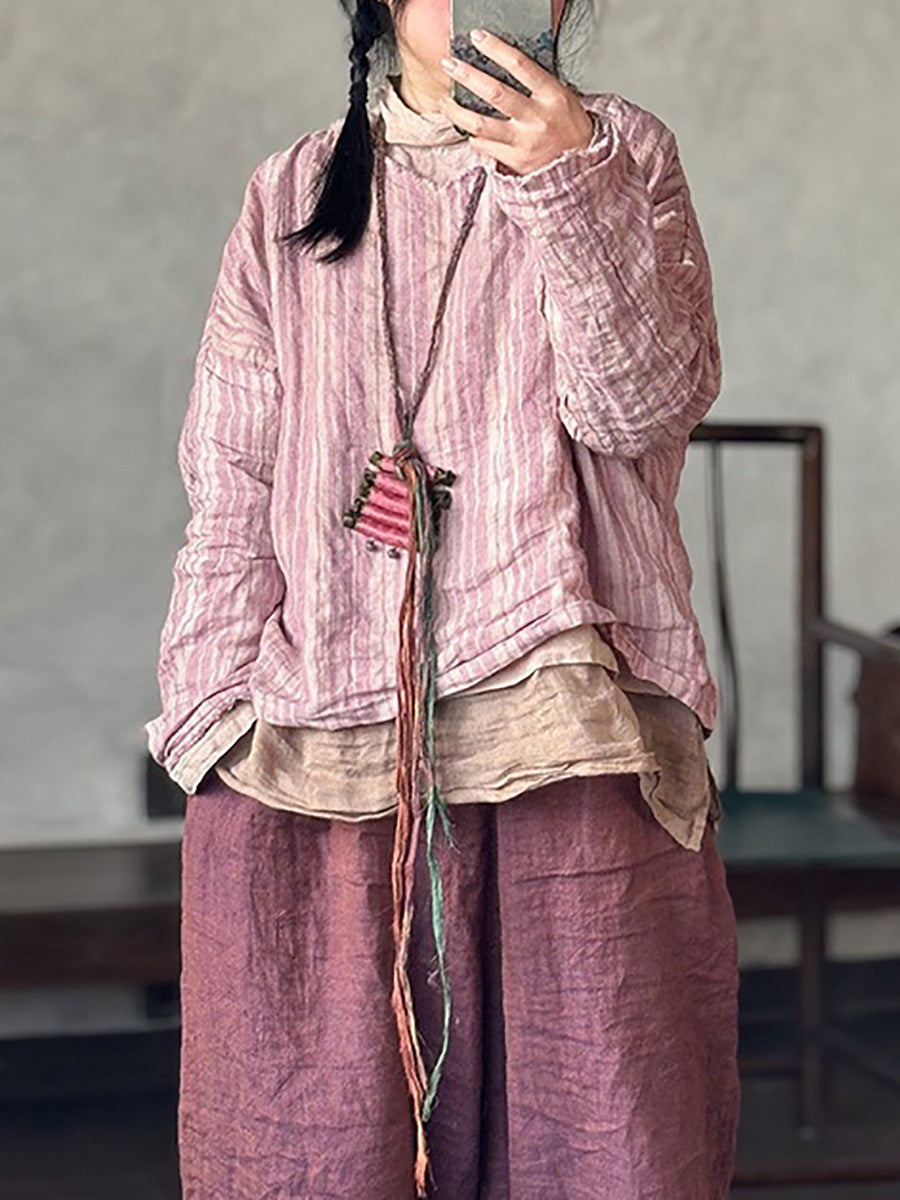 Plus Size Women Summer Retro Stripe V-Neck Linen Shirt
